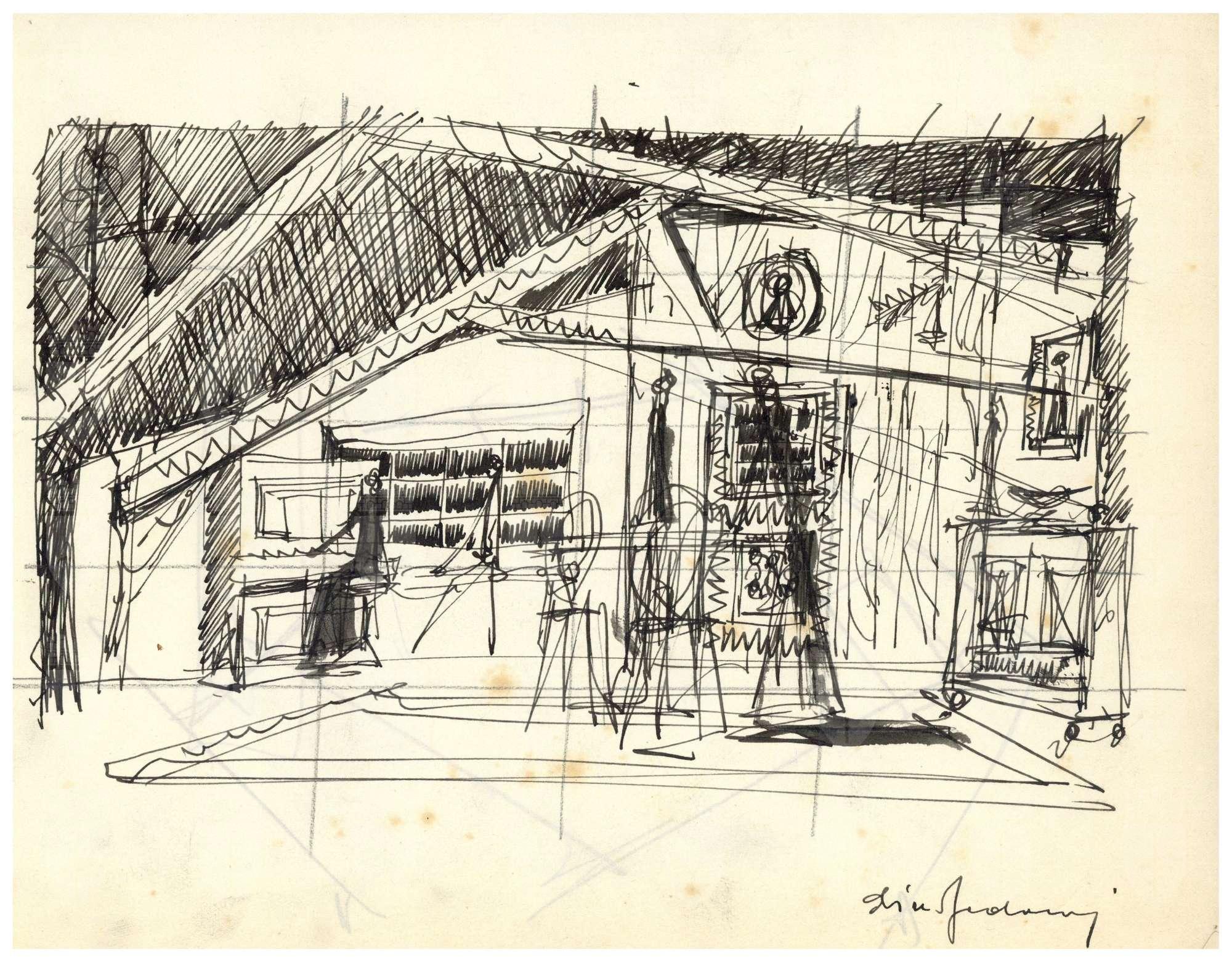 Davide e Golia, opera di Georg Kaiser. Atto 1. Interno di mansarda con tetto spiovente e travi a vista. A sinistra: sagoma di persona seduta a un pianoforte a muro, finestra vetrata con griglie a riquadri. Al centro: tavolo con 4 sedie e sullo sfondo porta in legno decorata e quadro appeso a parete. A destra credenza e quadro alla parete. Disegno preparatorio per BZ 4/943