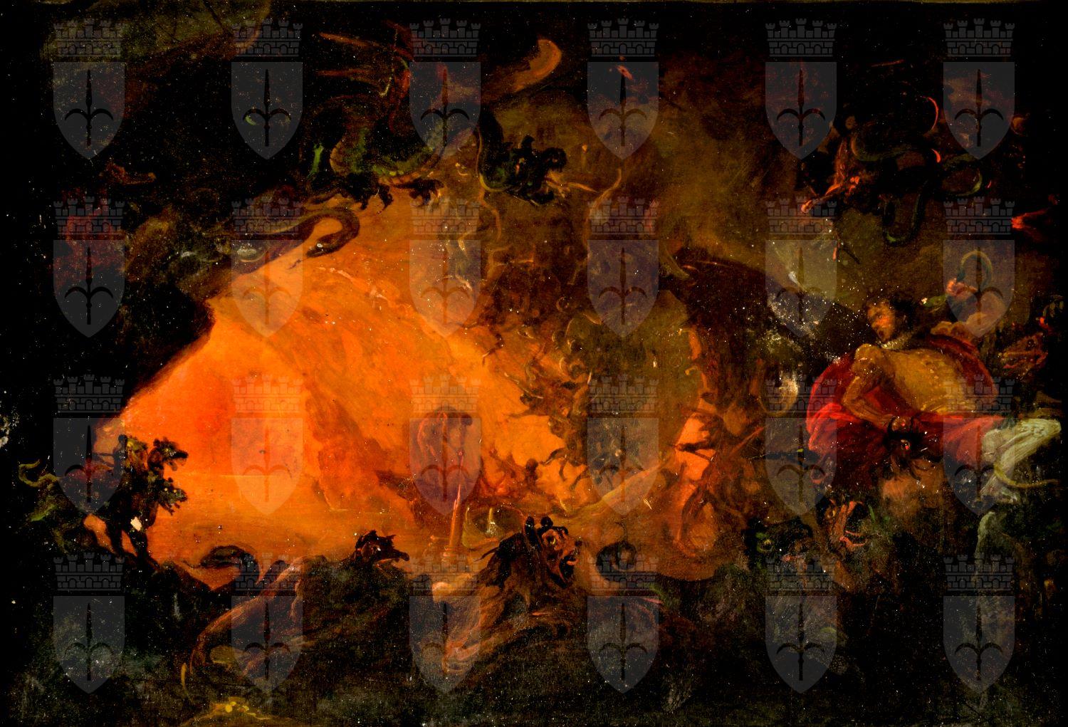 A Trieste G.B.Bison si conquistò una grande fama con i due cicli di affreschi eseguiti nel Palazzo Carciotti (1804) e nel Palazzo della Borsa (1807). Il Museo Revoltella conserva un numero considerevole di dipinti e di bozzetti, tra cui cinque studi per le scenografie del "Don Giovanni" di Mozart: Il duello, La sfida, Il convito e due versioni della scena All'inferno, pervenuti tutti (tranne quello in questione) nel 1940 grazie al legato di Carlo e Maria Piacere. Il dipinto in esame documenta l'impegno dell'artista in campo teatrale, come rivelano anche i bozzetti per i costumi di scena de "Il sogno di Corvo", rappresentato al Teatro Nuovo di Trieste il 12 febbraio 1814. Inoltre, secondo la testimonianza di Ranieri Mario Cossar, nel 1810 Bison avrebbe eseguito vari lavori anche per per il Teatro di Gorizia. L'opera in esame segue uno schema scenografico settecentesco. "L'inquadratura sotterranea permette di evidenziare l'acceso cromatismo, tutto fondato sui contrasti affocati e nei quali si può cogliere la velocità di tocco e la capacità di annotazioni narrative che consentivano al Bison di passare facilmente dal tema teatrale al soggetto da collezione" (F.Magani in "Ottocento di frontiera"...1995, p. 106)