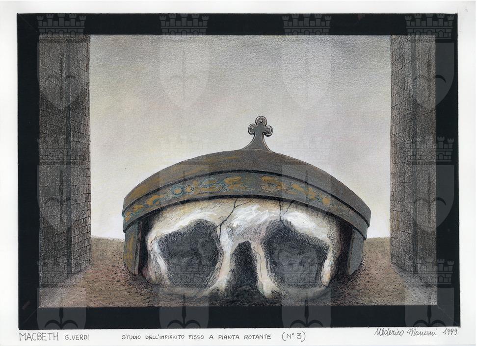 Macbeth, opera lirica di Giuseppe Verdi. Imponente impianto scenico a pavimento, in pendenza verso il fondo del palcoscenico a forma di corona con punta centrale decorata a trifoglio, occupa tutto lo spazio scenico e rivela la parte superiore di un teschio su cui la corona poggia e la cui parte inferiore affonda nel palcoscenico. Ai lati due alte mura con fessura centrale per il paesaggio. Luce bianca/ grigia