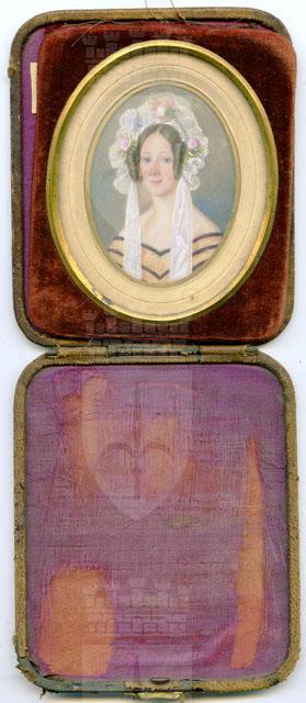 L’astuccio, pervenuto con il lascito Margherita Nugent, racchiude un ritratto femminile di una gentildonna della famiglia Zanchi. L’abito, ampiamente scollato, e il cuffione di velo trasparente che si apre a raggera dietro la testa, lavorato a merletto e intrecciato con un nastro da allacciare e annodare sotto il mento, indirizzano a una datazione verso gli anni '30 del XIX secolo.