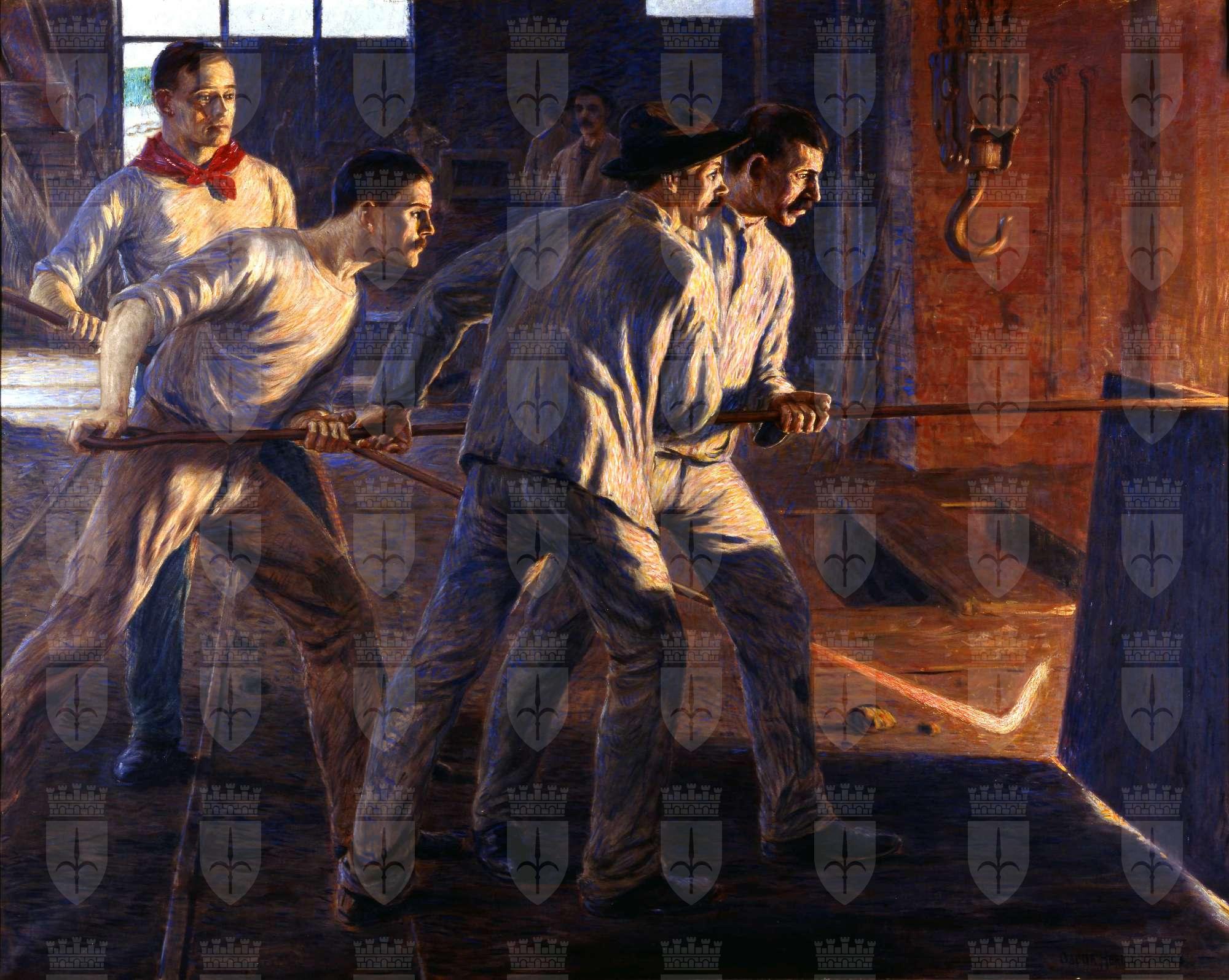 Il dipinto, acquisito dal Museo Revoltella nel 1997, appartiene al periodo giovanile di Hermann-Lamb, che nei primi anni del secolo, dopo gli studi condotti a Monaco e a Roma, iniziò ad operare ed esporre tra Vienna e Trieste, per trasferirsi definitivamente a Vienna proprio nel 1903, anno di esecuzione di questo lavoro. Verosimilmente questa tela si può identificare con l'opera "I fonditori", così descritta dal Sibilia: "Uno dei suoi primi lavori, esposti nel salone d'arte dello Schollian, fu un grande quadro intitolato 'I fonditori' comperato, poi, molti anni dopo, dal signor Bleckmann di Murzuschlag, proprietario di una delle più grandi acciaierie della Stiria. Il quadro non presenta a chi l'osservi nessun motivo particolare di improvvisa ammirazione come composizione, perché raffigura semplicemente quattro fonditori che lavorano nell'officina: invece, come tecnica coloristica, è buono perché l'autore ha saputo trarre dal fuoco della fornace, dal calore che sprizza dal metallo in liquefazione un vivo effetto di rossi e di rossastri bene intonati al colore bleu con il quale sono dipinti i quattro operai". Effettivamente l'interesse maggiore dell'opera risiede nella tecnica "dei colori divisi" utilizzata dall'artista per aumentare la luminosità delle figure rischiarate dai bagliori del fuoco, ma questo non basta ad attenuare la staticità dei corpi e a raggiungere quelle atmosfere magiche dei dipinti di Klimt che probabilmente avevano costituito un modello fondamentale per il giovane artista. Quanto alla scelta del soggetto, Sibilia ci dice anche che nei primissimi anni del secolo Hermann Lamb aveva fatto dei ritratti e dei lavori di decorazione per la famiglia Bohler di Vienna, proprietaria di acciaierie. Appare probabile, perciò, che sia stata questa a commissionare il dipinto. Va segnalato, comunque, che nel 1902 Hermann-Lamb aveva fatto un bel ritratto ad Alfonso Canciani, scultore friulano che si stava affermando a Vienna anche per certe efficaci figure di lavoratori e che a sua volta avrebbe lavorato per la famiglia Bohler, utilizzando le figurine dei Quattro lavoratori del ferro e del fuoco , del 1907, (una copia di due delle quattro è posseduta dal Museo Revoltella, v. scheda n. ) per il progetto di una lampada funeraria. E'evidente che il contatto con il più anziano e ormai affermato Canciani aveva inciso nelle scelte di Hermann-Lamb. E'meno sicuro che egli abbia avuto contatti con il Divisionismo milanese e con la pittura di impegno sociale di Pellizza da Volpedo, di cui, però, vale la pena ricordare che solo l'anno prima (1902) aveva esposto a Torino il celebre Quarto Stato.