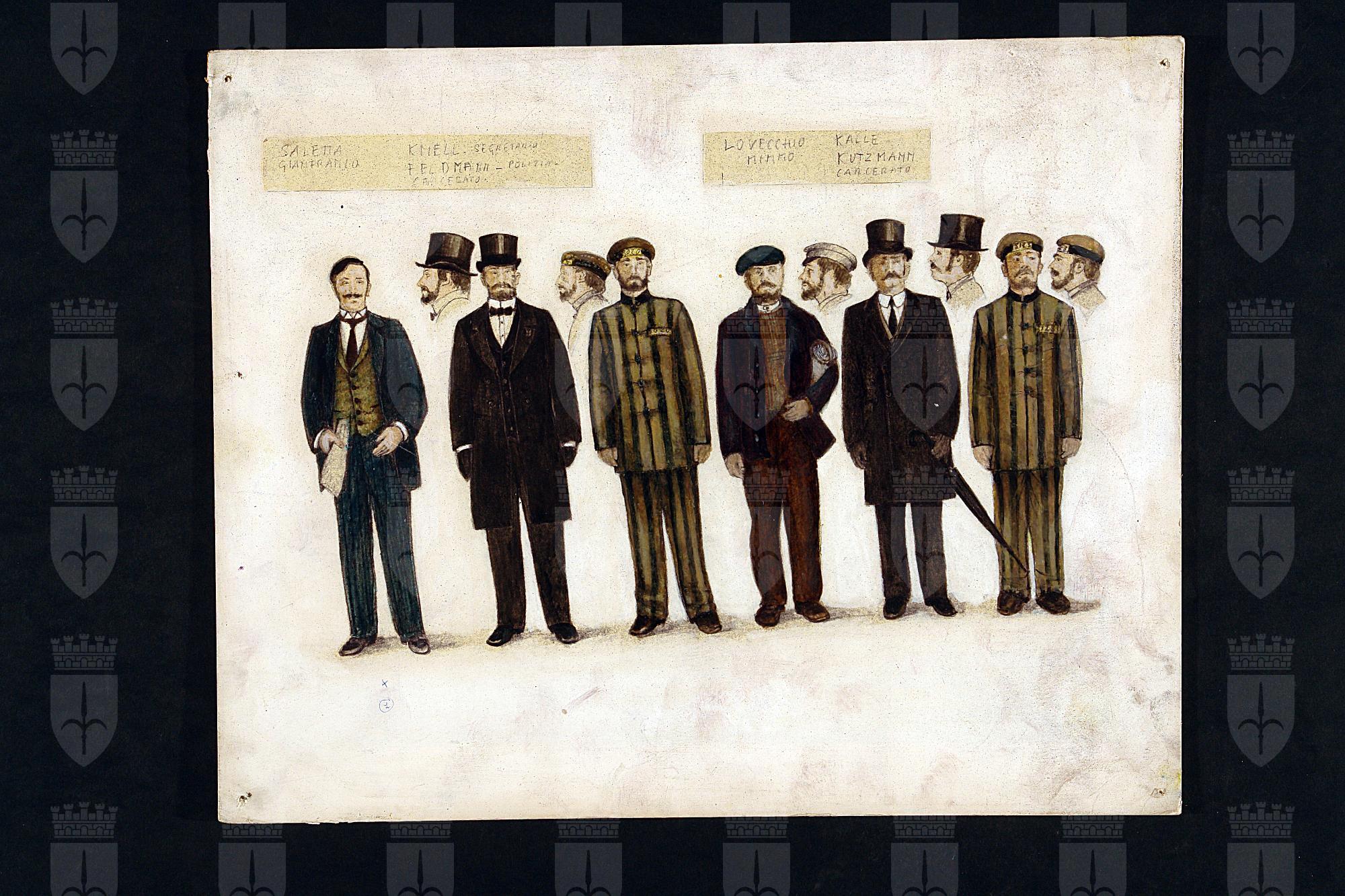 Il capitano di Köpenick di Carl Zuckmayer. Figure maschili intere, da sinistra: segretario, poliziotto, carcerato, Kalle, Kutzmann, carcerato.