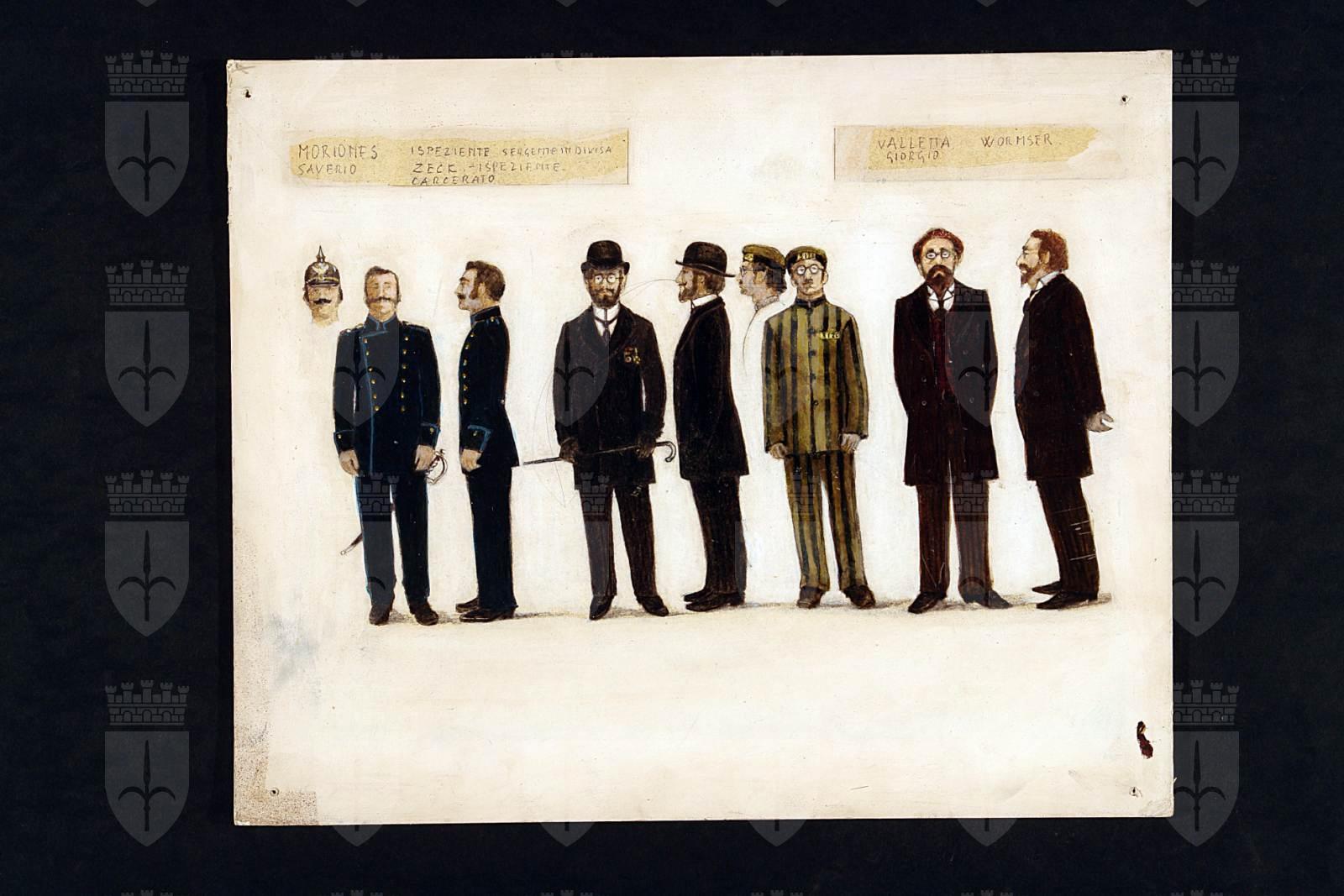 Il capitano di Köpenick di Carl Zuckmayer. Figure maschili intere, da sinistra: sergente in divisa, ispeziente, carcerato, Wormser.