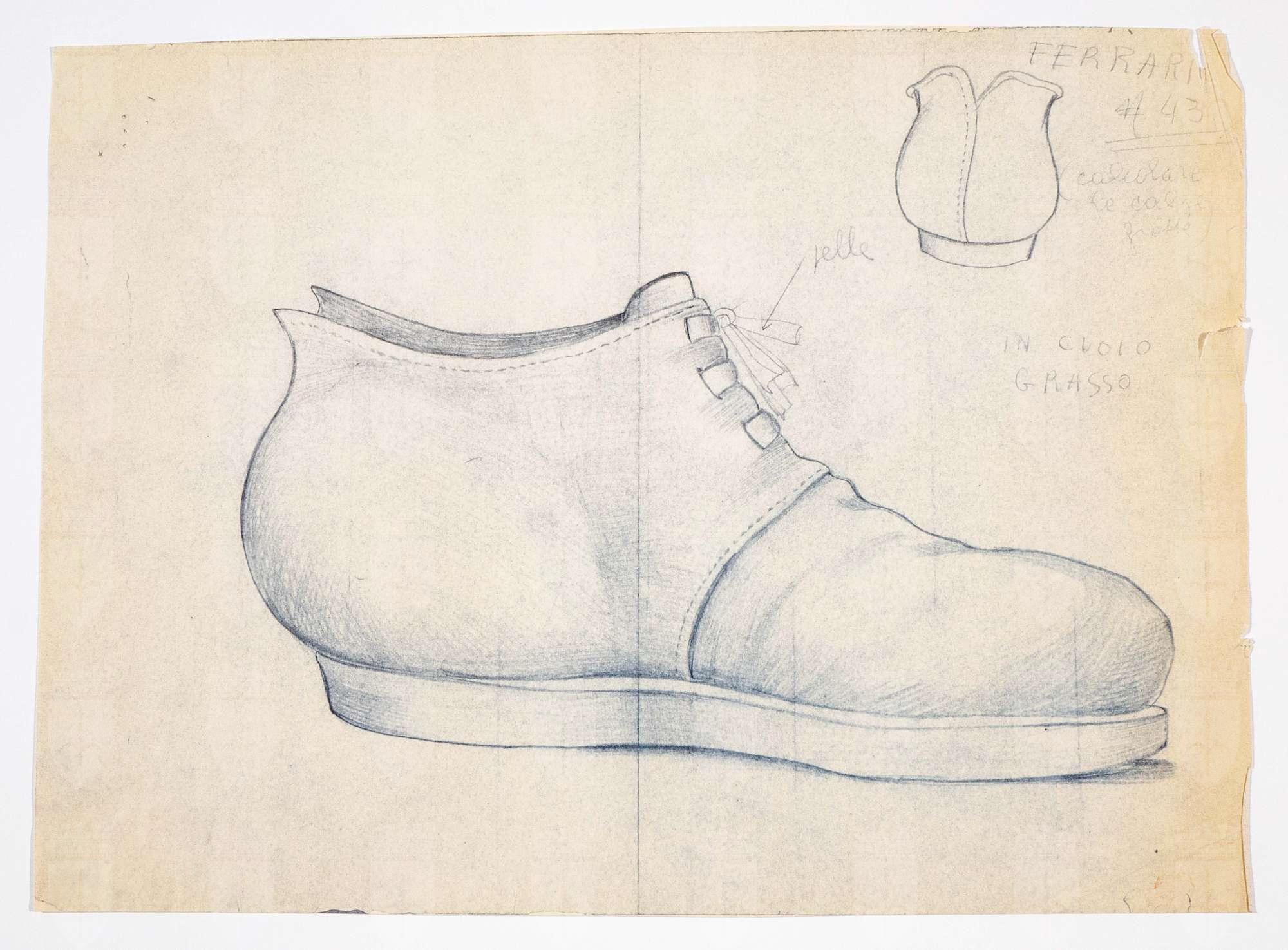 Il gioco dei potenti, libero adattamento di Giorgio Strehler da Enrico VI, dramma storico di William Shakespeare, in 15 atti e 2 giornate. Calzatura bassa e tozza, con punta tonda e lacci, di profilo verso destra. In alto a destra veduta della sua parte posteriore.