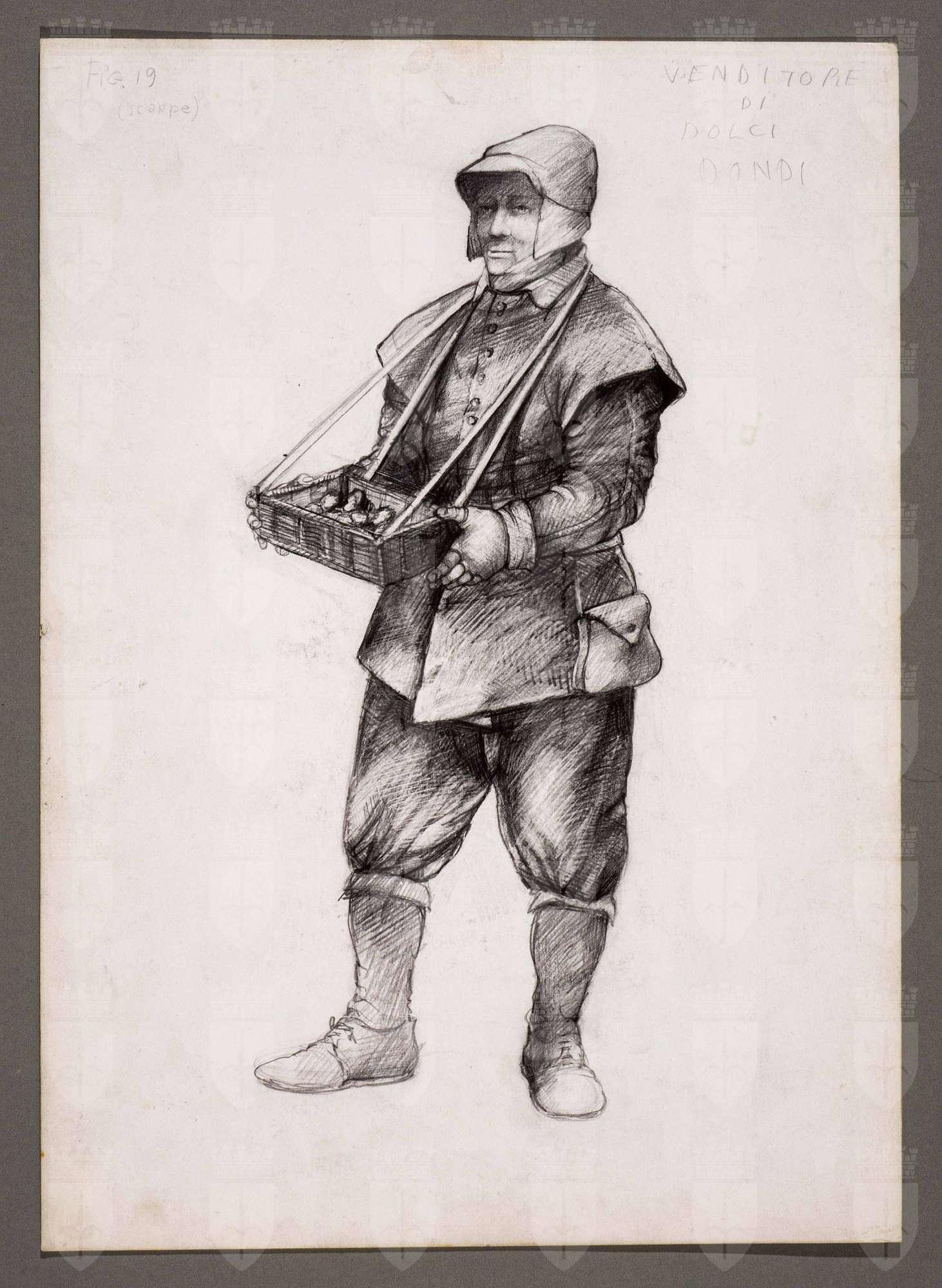 Il gioco dei potenti, libero adattamento di Giorgio Strehler da Enrico VI, dramma storico di William Shakespeare, in 15 atti e 2 giornate. Figura maschile in piedi, di tre quarti verso sinistra. Indossa un copricapo a cappuccio con frontino e paraorecchie, una giubba con spalle spioventi, guanti senza dita, brache al ginocchio, calze grosse. Porta una borsa legata al suo fianco destro e, sul davanti, un cestino rettangolare con dolciumi appeso al collo da una doppia cinghia