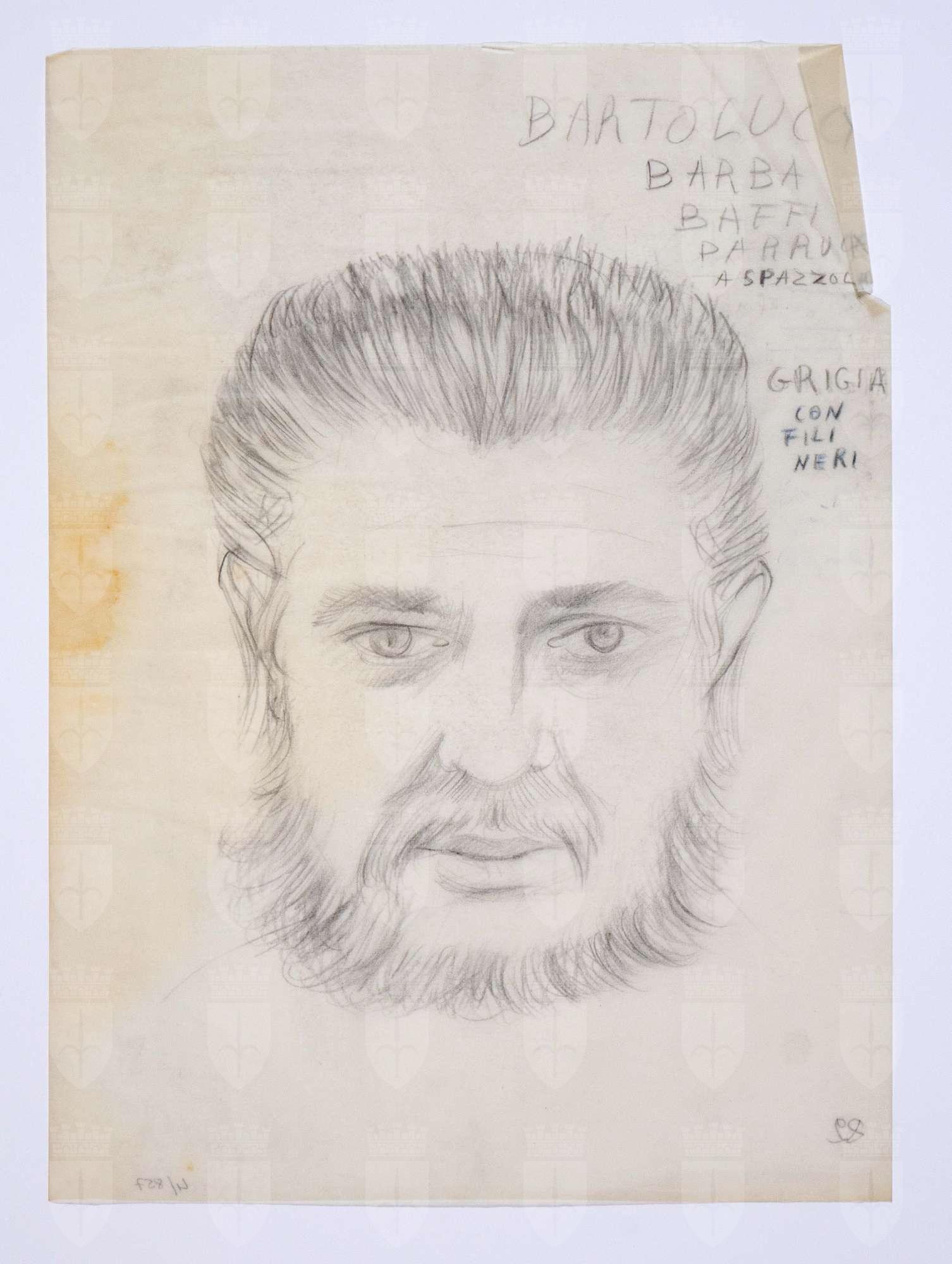Il gioco dei potenti, libero adattamento di Giorgio Strehler da Enrico VI, dramma storico di William Shakespeare, in 15 atti e 2 giornate. Ritratto di testa maschile di fronte, a capo scoperto con folti capelli, barba e baffi.