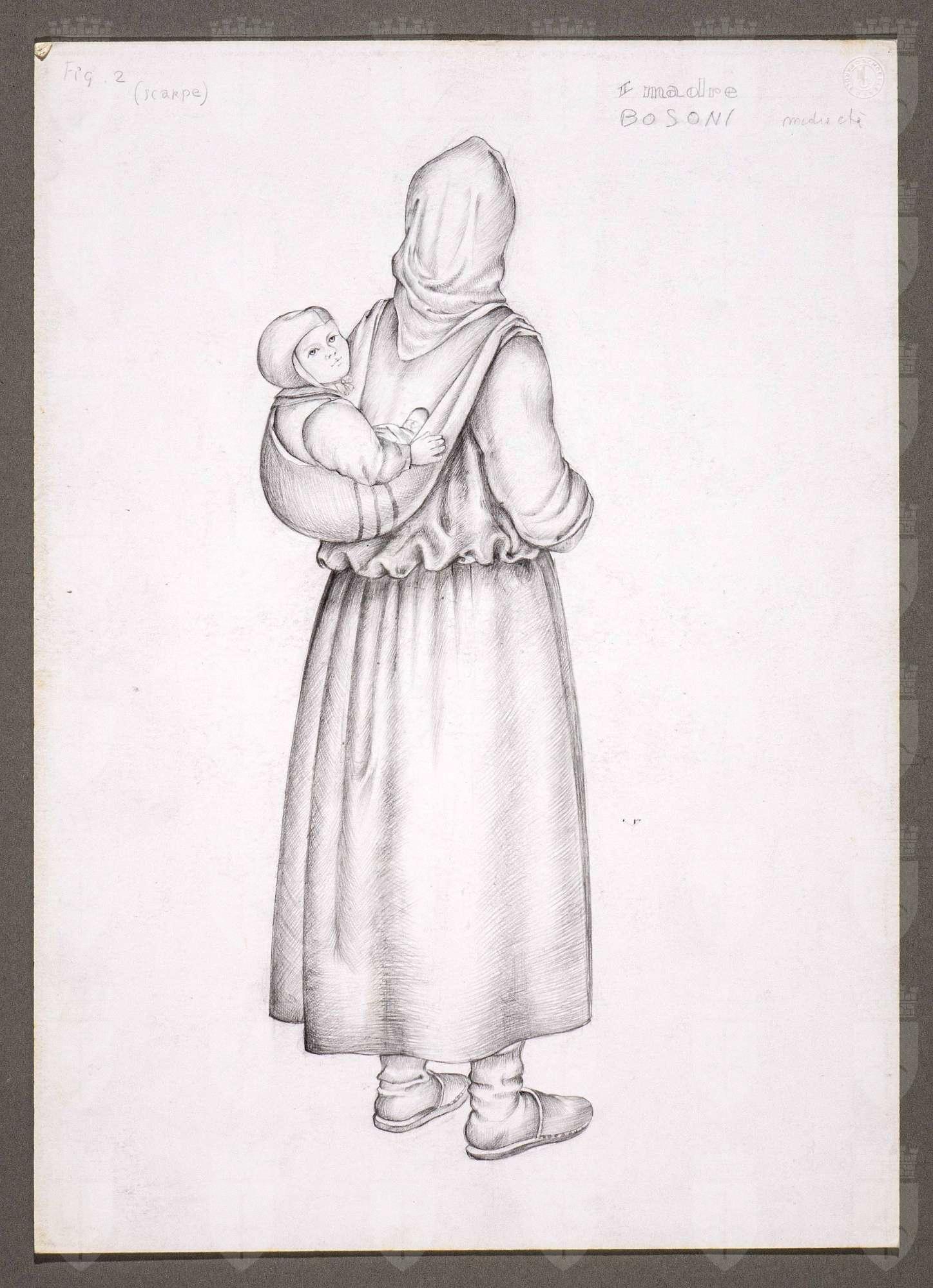 Il gioco dei potenti, libero adattamento di Giorgio Strehler da Enrico VI, dramma storico di William Shakespeare, in 15 atti e 2 giornate. Ritratto di figura femminile in piedi di spalle; regge un bambino con cuffietta in un marsupio sulla schiena, ha il capo coperto da un fazzoletto, indossa un abito semplice spezzato da un'arricciatura in vita, calze e scarpe aperte sul retro.