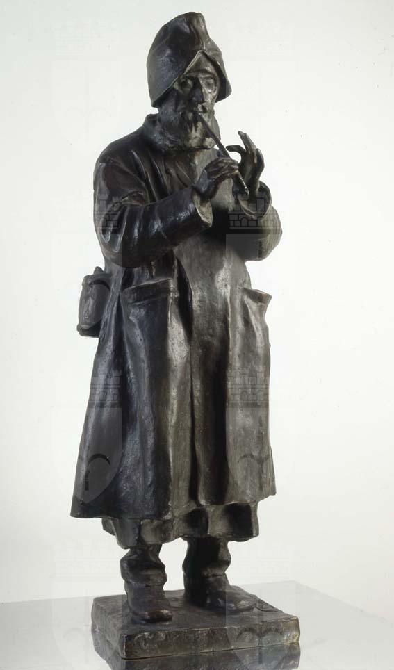 L’opera raffigura un uomo anziano a figura intera, coperto da un pastrano mentre suona un piffero che tiene fra le mani. Di quest’opera si conoscono più versioni, una delle quali facente parti della Raccolta Lercaro, costituitasi per volere e impegno del cardinale Giacomo Lercaro, inizialmente grazie alle donazioni al cardinale stesso in occasione del suo ottantesimo compleanno. La raccolta si è poi progressivamente ampliata grazie a donazioni, e ora conta 1800 opere, e fu inaugurata nel 1989. Inizialmente ospitata presso la Galleria d’Arte Moderna di Bologna, è dal 2003 presso l’Istituto Veritatis Splendor. Interessato alla scultura di genere che nella vasta produzione di questo artista occupa un posto importante, si ricorda che un nucleo di sue opere dello stesso tipo sono conservate presso la Galleria d’Arte Moderna di Milano. Tra queste anche il gesso dal titolo Esaurimento, che denota una certa vicinanza con il lavoro di Trieste. Si tratta di una figura di vecchio seduta con cappotto sulle spalle, gambe aperte e braccia congiunte all’altezza delle ginocchia. Le mani sovrapposte sono appena sopra il braciere; lo sguardo perso nel vuoto. L’adesione alle problematiche del realismo sociale da parte dello scultore, però, non viene mai espresso attraverso un realismo esagerato. L’opera del Revoltella è entrata a far parte della collezione museale tramite permuta con la “Galleria Trieste” del quadro Il legaccio di Lino Selvatico.