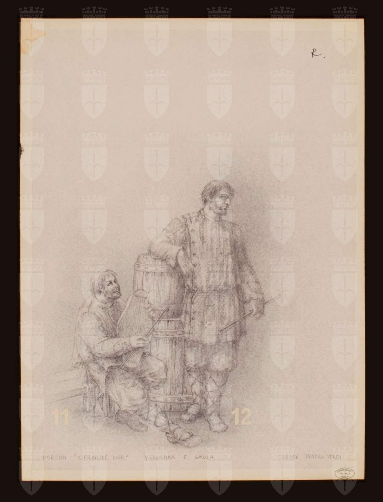 Il principe Igor, opera di Aleksandr Porfir'evič Borodin. Costume per Yeroshka e Skula. Due figure maschili intere. La figura di destra in piedi e girata di sinistra di 3/$ indossa casacca rattoppata e rigata ad abbottonatura laterale, largo pantalone rigato al ginocchio, gambali di stoffa con legacci, tiene con la mano sinistra un archetto. La figura di sinistra seduta e girata di tre quarti verso sinistra con la gamba destra allungata, indossa casacca ad abbottonatura centrale, calzone al ginocchio con rattoppi, gambali di stoffa con legacci. Sorregge con la mano sinistra uno strumento a corde e con la destra un archetto. Al centro della scena 2 botti sovrapposte, sulla sinistra una panca bassa.