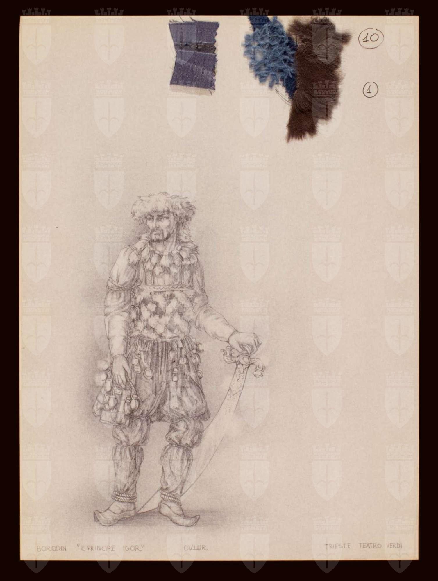 Il principe Igor, opera di Aleksandr Porfir'evič Borodin. Costume per Ovlur. Figura maschile intera. Indossa: copricapo a fascia di pelliccia, casacca a più strati con ornamenti in pelliccia, cordoni, monili, che pendono anche dalla cinta, pantalone alle caviglie con legature, sopragonna alle ginocchia, scarpe a punta rivoltata, con la mano sinistra regge una scimitarra che poggia a terra.