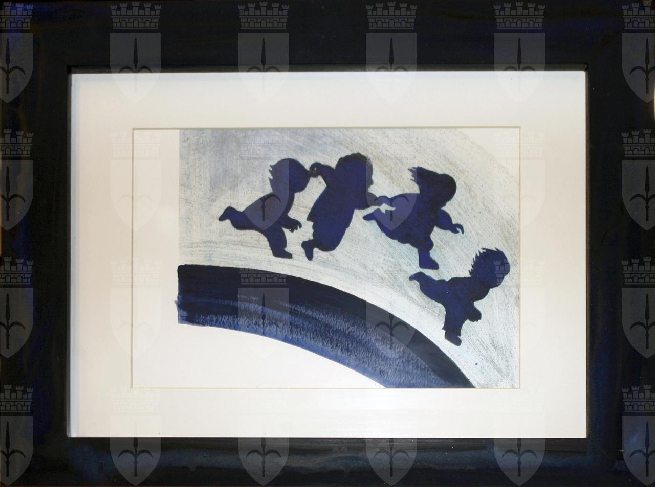 Quattro bambini resi con una sagoma blu corrono e saltano sospesi sopra un arco blu intenso, lo sfondo è di un azzurro grigiastro.
