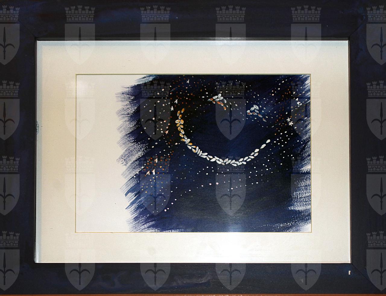 Sulla parte destra del foglio, una macchia blu scuro fa da sfondo a un sorriso stilizzato realizzato con chicchi di riso, attorno altri chicchi di riso, punti chiari e piccole stelle.