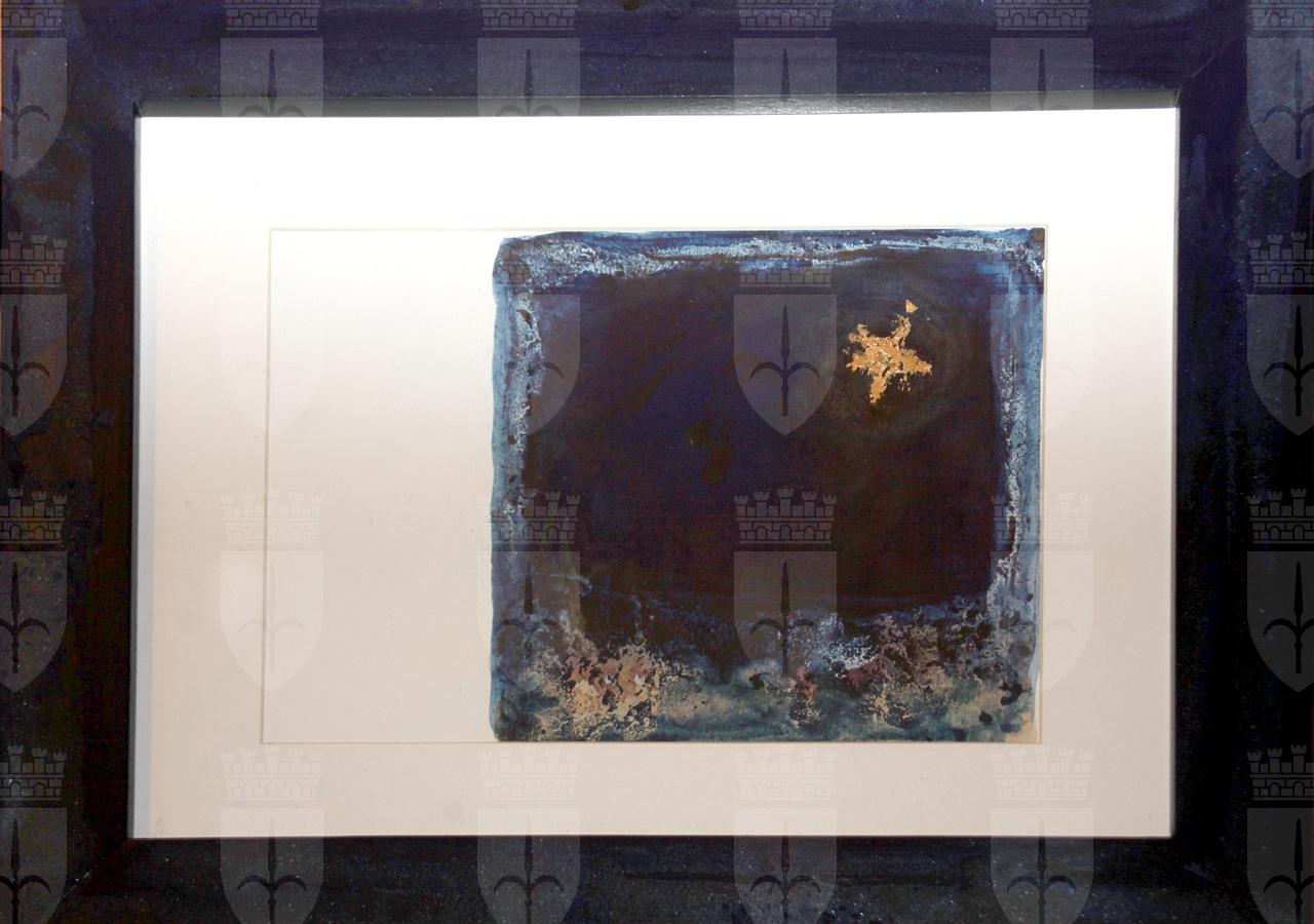 Il foglio è diviso a metà: a sinistra bianco, a destra una stella oro campeggia in alto a destra su un rettangolo blu scuro che ha un contorno sfumato con tracce oro.