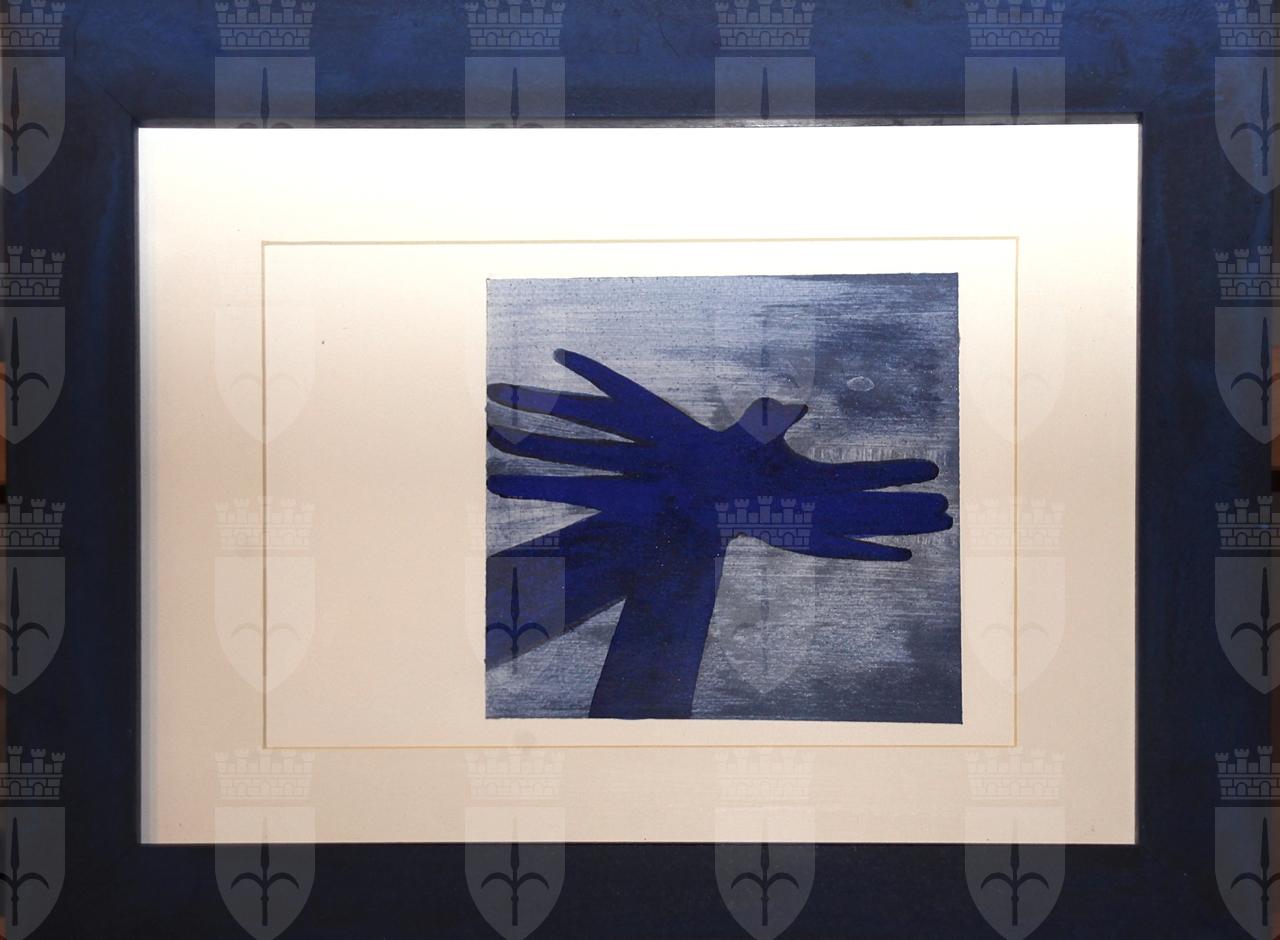 Lo sfondo è un quadrato azzurro posto sulla destra del foglio, due mani di un blu intenso si intrecciano a formare una colomba.