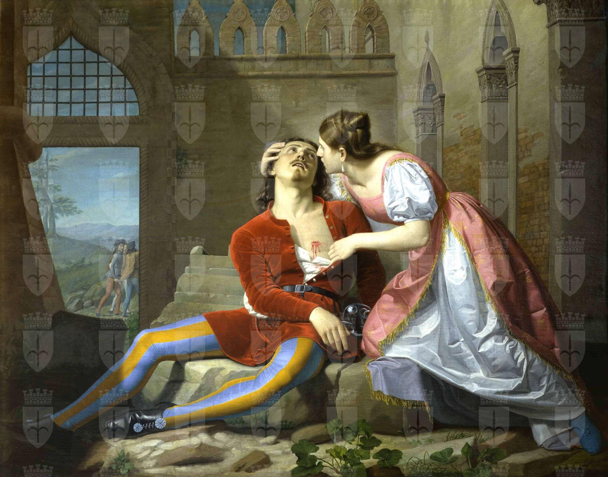 L'opera costituisce la prima prova di un certo impegno eseguita dall'artista ferrarese che all'epoca era solo ventisettenne. Come risulta dalle carte di Oreste Basilio, il dipinto si trovava nella collezione triestina di Giovanni Guglielmo Sartorio già nel 1850, quando venne esposto a Trieste. Ereditato dalla baronessa Carolina Sartorio, venne da questa donato al Museo nel 1899. Il soggetto del dipinto in questione è tratto dal romanzo di Defendente Sacchi "I Lambertazzi e i Geremei" del 1830. Qui viene rappresentata la scena in cui è stato appena compiuto il delitto ad opera dei fratelli di Imelda nei confronti di Bonifacio, la cui famiglia era di fazione avversa a quella della fanciulla. Le figure degli amanti giganteggiano al centro del cortile interno secondo moduli proporzionali cari alla pittura emiliana del Seicento. Elementi di derivazione guercinesca sono rintracciabili anche nella posa e nell'impianto disegnativo delle figure, mentre l'apertura paesistica oltre la porta e le erbe in primo piano, assieme ad un caldo cromatismo, rimandano alla pittura veneta del '500.
