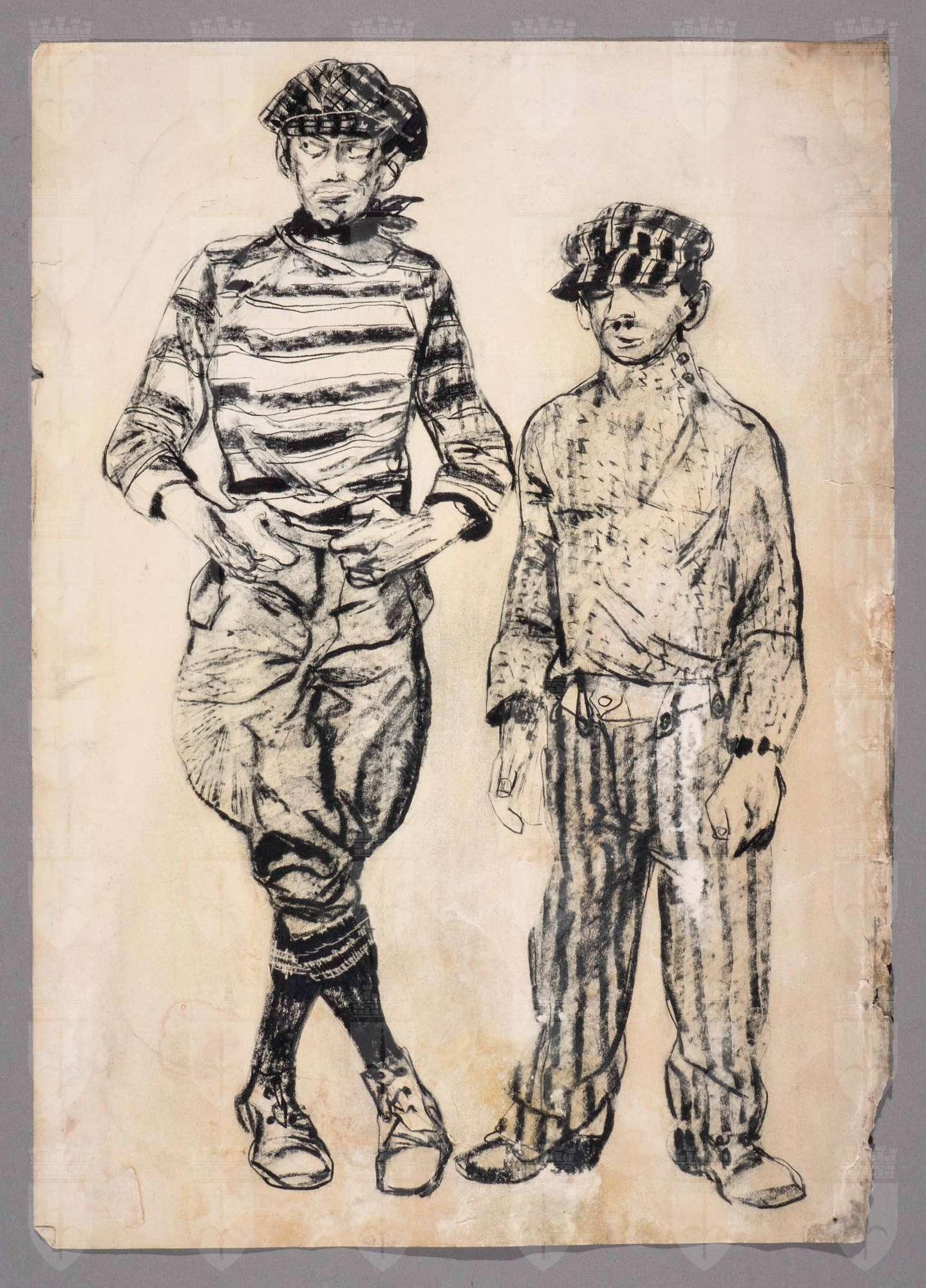 L'opera da tre soldi di Bertolt Brecht e Kurt Weil. Due figure maschili in piedi in atteggiamento da giovinastri di mala vita. Indossano entrambi un copricapo a coppola calato sugli occhi. La figura di sinistra, più alta, indossa un piccolo fazzoletto legato al collo, una maglia a righe, pantaloni alla zuava, calzettoni e scarpe con lacci alla caviglia. La figura di destra indossa una maglia a collo alto, pantaloni rigati e scarponcini.
