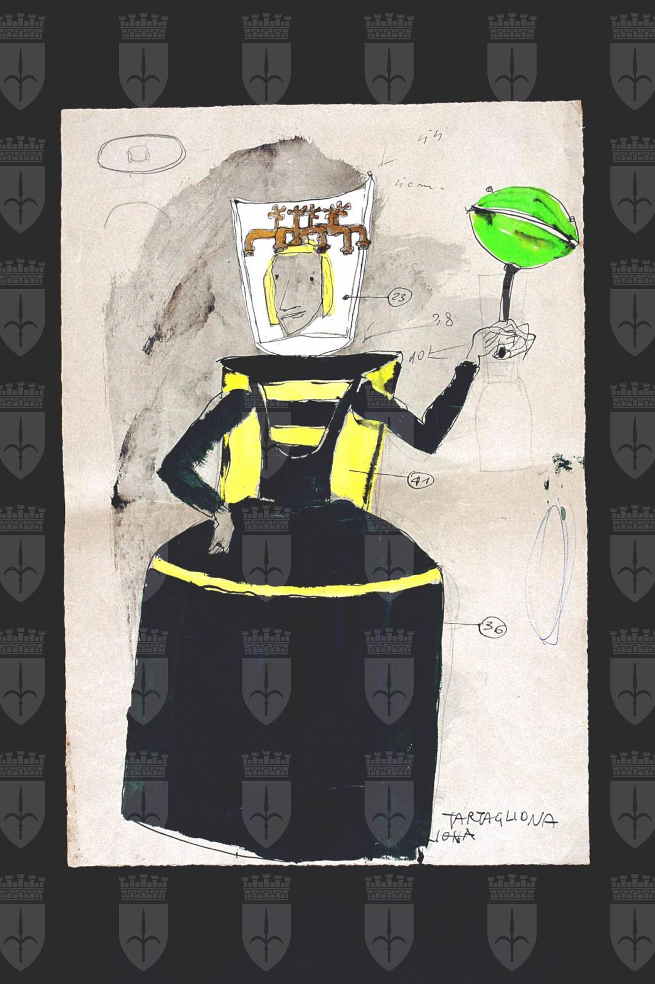 L'augellin Belverde, testo teatrale di Carlo Gozzi, figura femminile regale con corona abito lungo, mantello e scettro.