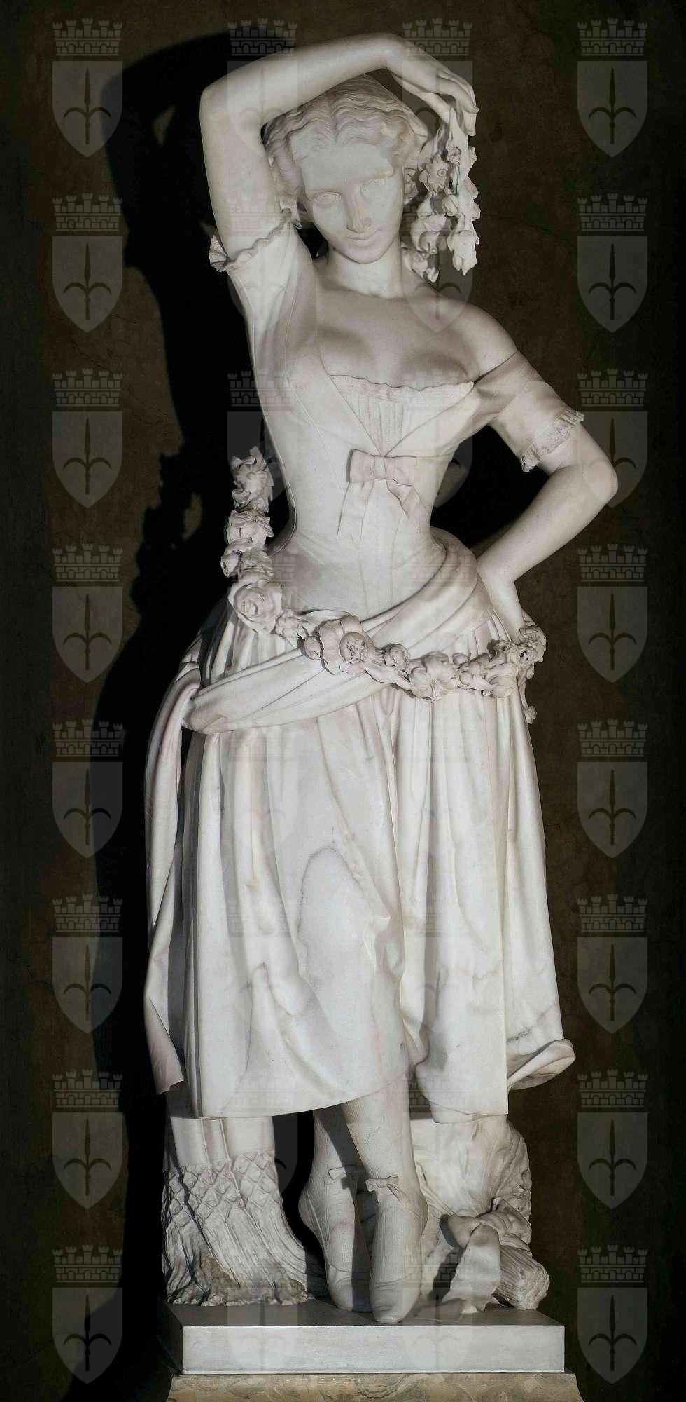 Risalgono al 1858 le quattro sculture di Pietro Magni che rappresentano le arti del teatro, delle quali fu data immediata notizia, come del Palazzo Revoltella appena edificato, e di molti altri edifici e attrattive della nostra città, nella guida intitolata "Tre giorni a Trieste", pubblicato nello stesso anno, a cura del medico Saul Formiggini, del barone e avvocato Giovanni Battista de Scrinzi, dello storico Pietro Kandler e dello stesso Pasquale Revoltella. «Altre quattro ottime sculture dello stesso Magni – si legge – rappresentanti la "Danza", la "Drammatica", l’"Armonia" ed il "Canto", universalmente ammirate, adornano la sala ottagona [...], tutta a specchi, che forma un magnifico colpo d’occhio». I quattro soggetti femminili visibili nella saletta angolare al secondo piano del palazzo, impreziosita dalla presenza degli specchi e dedicata alla socialità femminile, sono strettamente legati alla figura di Revoltella che, proprio in quegli anni, oltre ad avere contribuito alla costruzione del Teatro L’Armonia a Trieste, aveva fortemente sostenuto l’eccellenza del teatro italiano su quello straniero. Alla fine degli anni Cinquanta, infatti, Revoltella si offrì di sostenere finanziariamente la compagnia dell’attore e capocomico Luigi Bellotti Bon, figlio d’arte (la madre era Luigia Ristori) e fondatore di diverse compagnie teatrali, tra cui la Ristori, che riuscì a primeggiare tra le altre compagnie europee, contribuendo in tal modo ad affermare in quegli anni la drammaturgia italiana. Le quattro sculture, valorizzate dal loro posizionamento entro le nicchie, e sostenute da preziosi piedistalli in marmo policromo – quasi a calcare un autentico palcoscenico – sono curate nei dettagli e rese espressive dalle pose diversificate ed estremamente naturali.