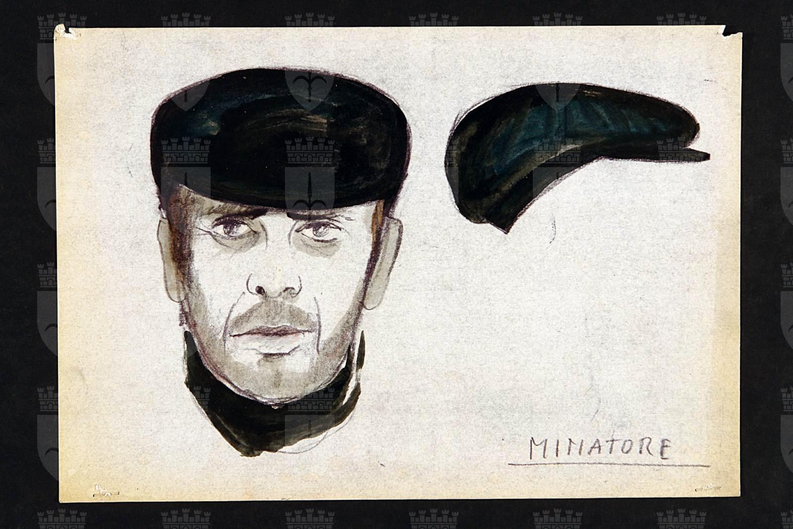 La danza del sergente Musgrave, testo teatrale di John Arden. Personaggio minatore, volto maschile con cappello e dolcevita, cappello di profilo a parte