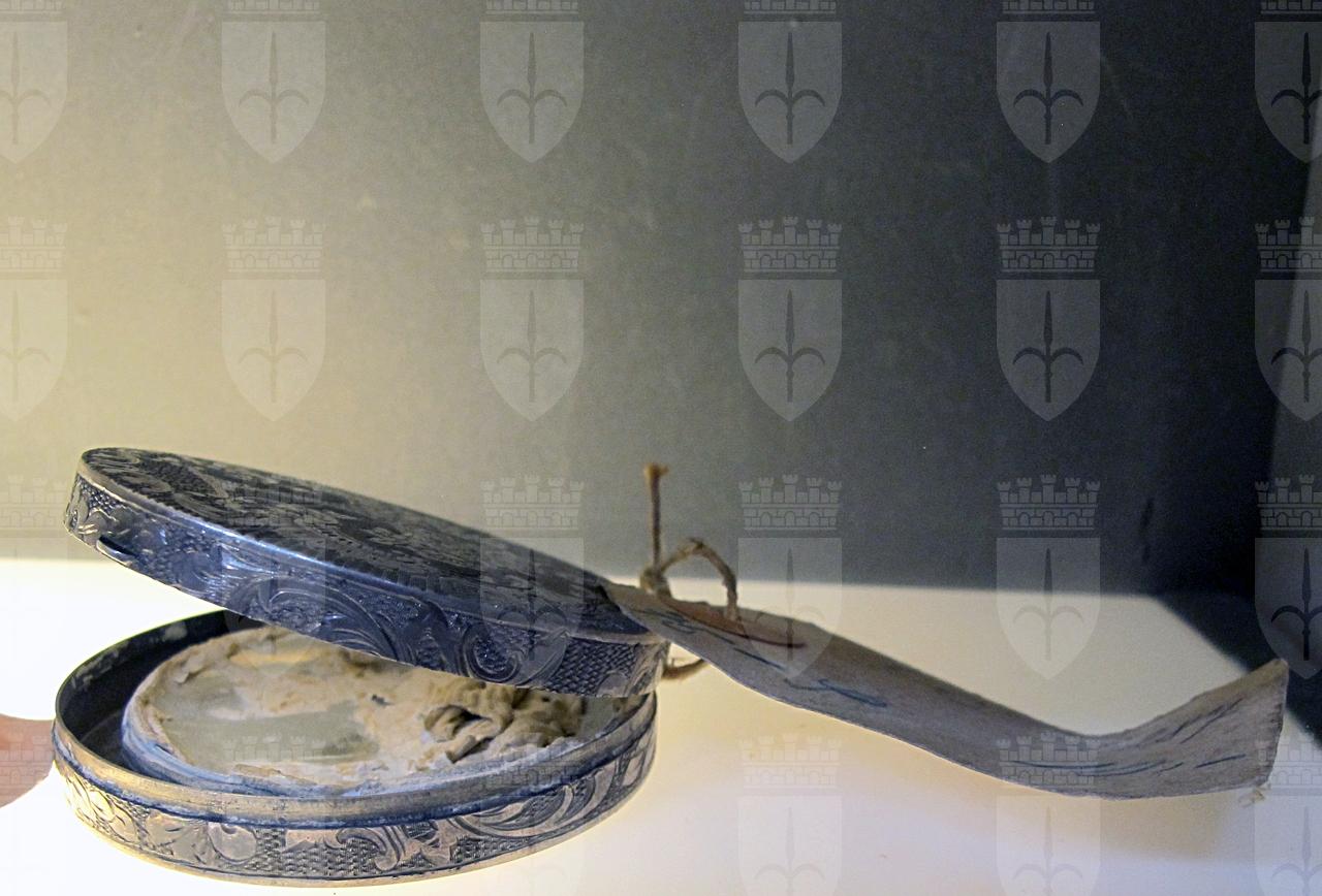 Il portacipria fa parte del nucleo di oggetti razziati dai nazisti dalle case degli ebrei triestini. Si è conservato l'astuccio, decorato, con parte della cipria che vi era contenuta.
