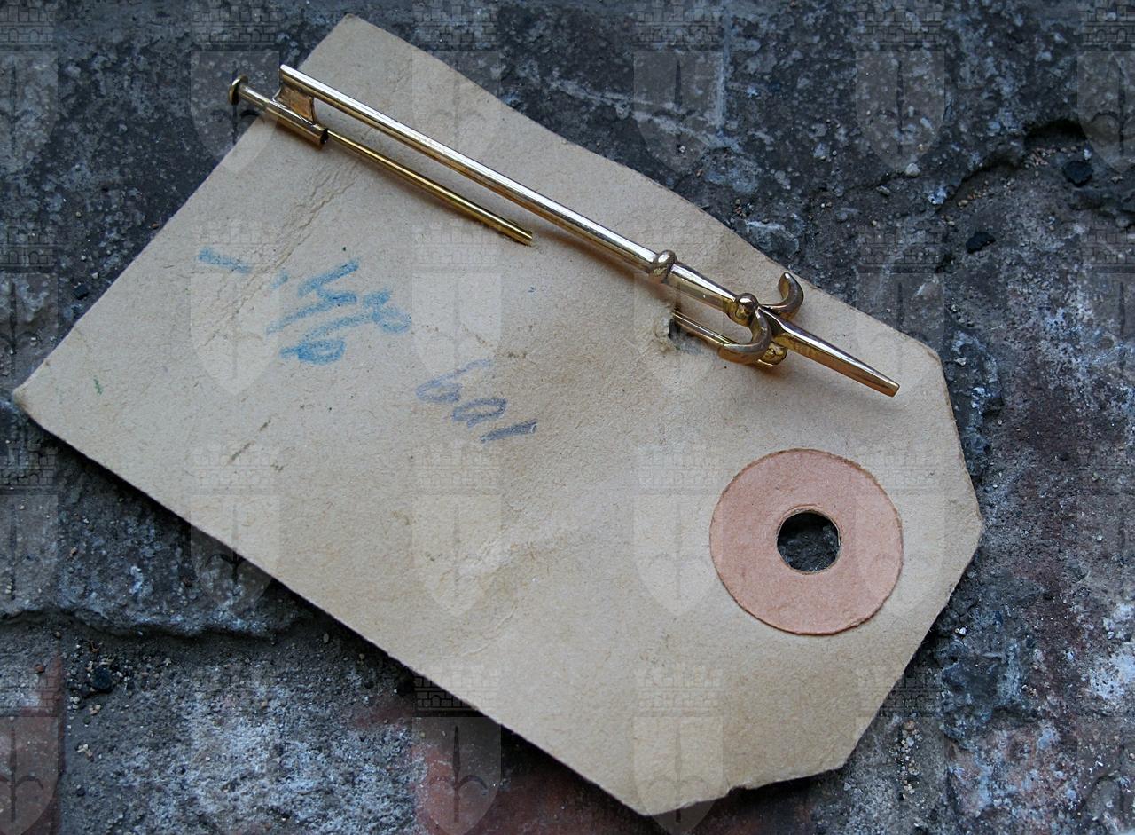 La spilla fa parte del nucleo di oggetti razziati dai nazisti dalle case degli ebrei triestini. Presenta un'alabarda.