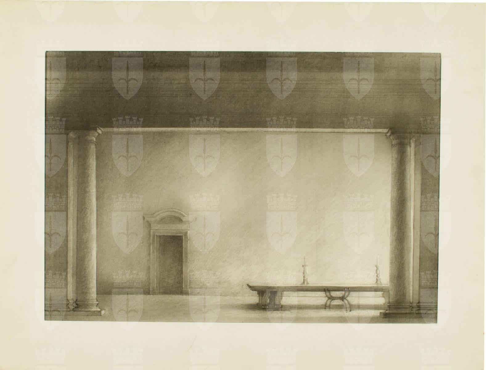 Otello, opera di Giuseppe Verdi, atto 3., castello. Interno con sala con 2 colonne di ordine toscano, tavolo marmoreo con due candelabri e uno scanno, porta sul fondale