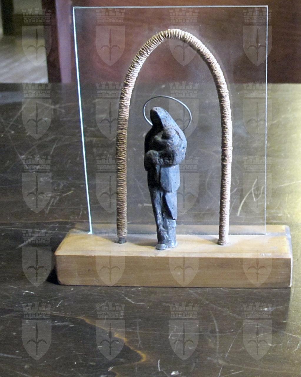 La sculturina rappresenta una Madonna stante con bambino, con aureola, entro un arco di ferro coperto con corda; poggia su un parallelepipedo di legno e le fa da sfondo un vetro inserito nel legno.