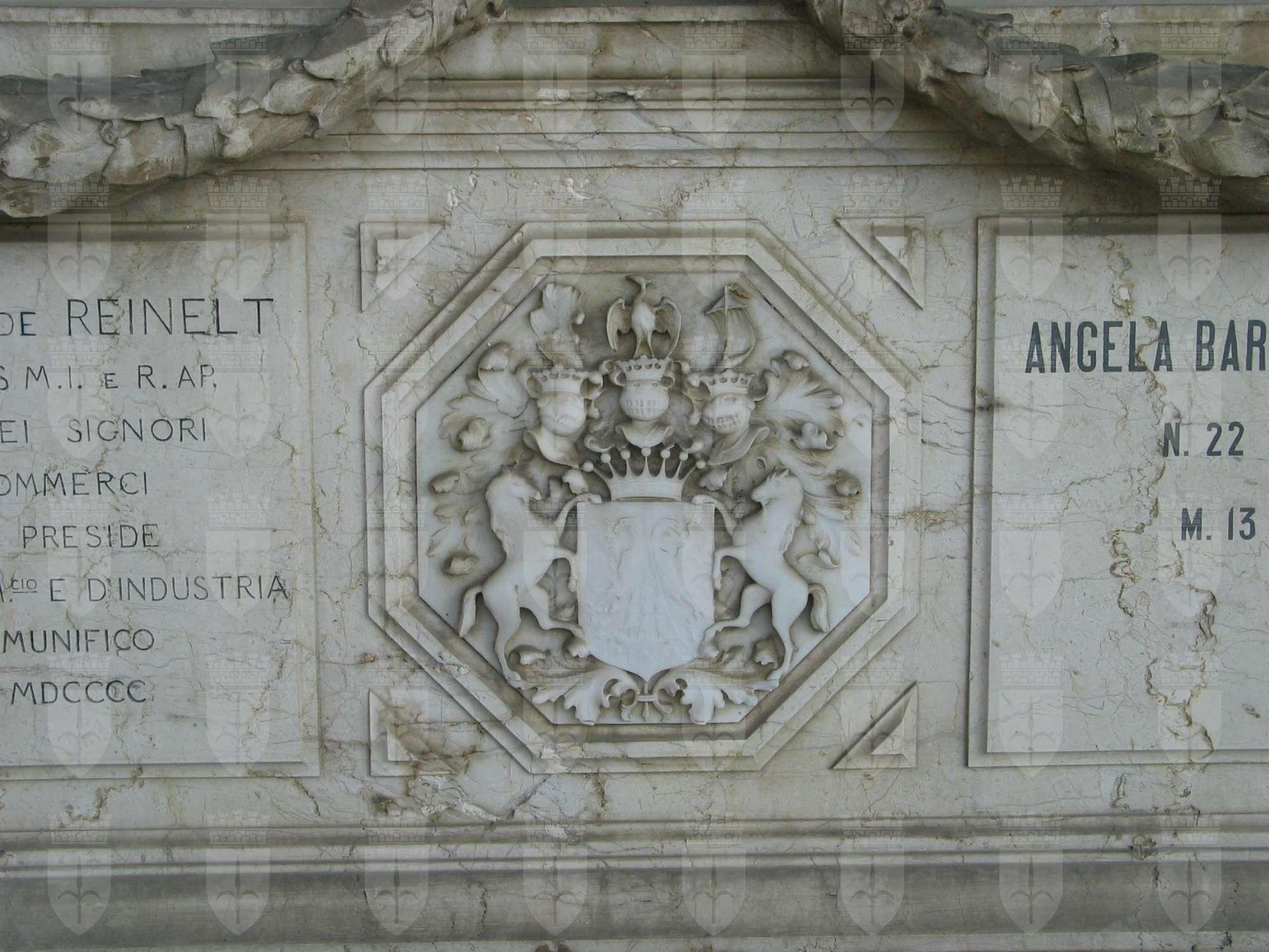 Sopra un'arca, sul cui fronte campeggia tra due iscrizioni lo stemma gentilizio, è seduta, su uno zoccolo marmoreo, una figura femminile avvolta in un lungo mantello, la guancia poggiata sconsolatamente sulla mano destra ed il gomito su di un plinto in pietra, lo sguardo perso rivolto a destra nel vuoto; alle sue spalle una stele, sulla cui sommità compare il mezzobusto del barone Carlo de Reinelt.