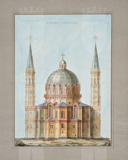 Entro passe-partout riquadrato, disegno ad acquerello, raffigurante la facciata posteriore di una chiesa di rito orientale. Si riconoscono le tre absidi, il transetto biabsidato su cui si erge la cupola e i due campanili.