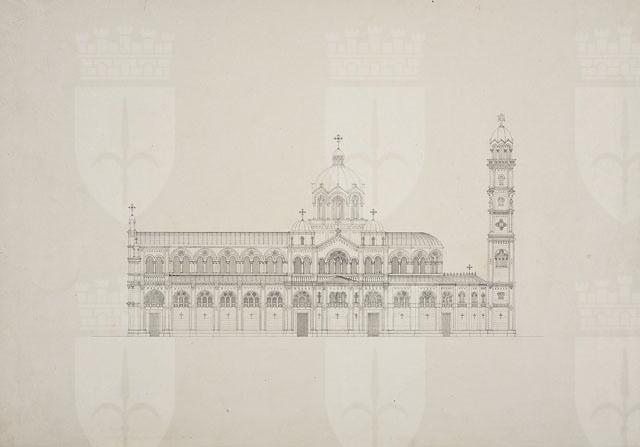 Si tratta di uno dei disegni del "Progetto di chiesa di tipo romanico con pianta a croce latina, con campanile posteriore" (cfr. CMSAOAR10_4129 - CMSAOAR10_4134), pervenuti nel 1953 nelle collezioni dei Civici Musei di Storia ed Arte attraverso l’acquisto Lituano Samero.