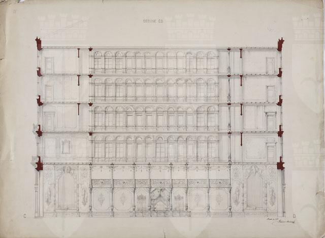 Si tratta di uno dei progetti per Casa Kosler (cfr. CMSAOAR10_4240-CMSAOAR10_4244), café chantant, realizzato in corso Italia a Trieste da Giovanni Andrea Berlam nel 1863 e demolito negli anni Trenta del XX secolo. Dal disegno in esame, si osserva che il piano terra, a pianta libera, con serie di colonnine in ghisa che reggono i piani superiori, è destinato ai tavolini e, in minima parte, ai servizi e all'ingresso. Ai piani superiori, gli spazi sono adibiti, come recitano le iscrizioni entro la lunetta delle porte ad arco, a "cucina"; "sonaglio"; "cessi"; "cameriere"; "bagno"; "telegrafo"; "scala"; "servizio". Le pareti e le balconate sono immaginate riccamente decorate con sculture, specchi, tendaggi e rilievi.