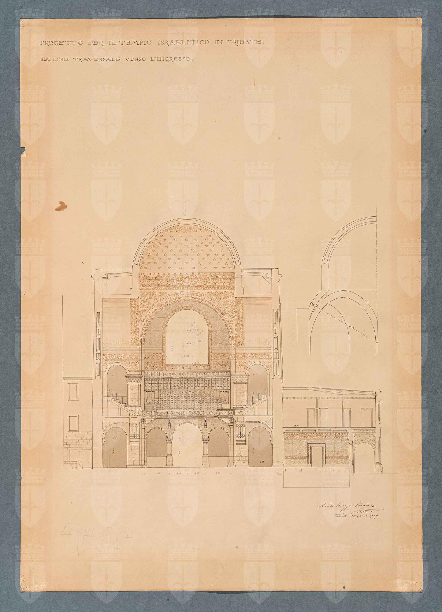 Tavola del progetto della Sinagoga di Trieste, raffigurante la sezione traversale verso l'ingresso dell'edificio.