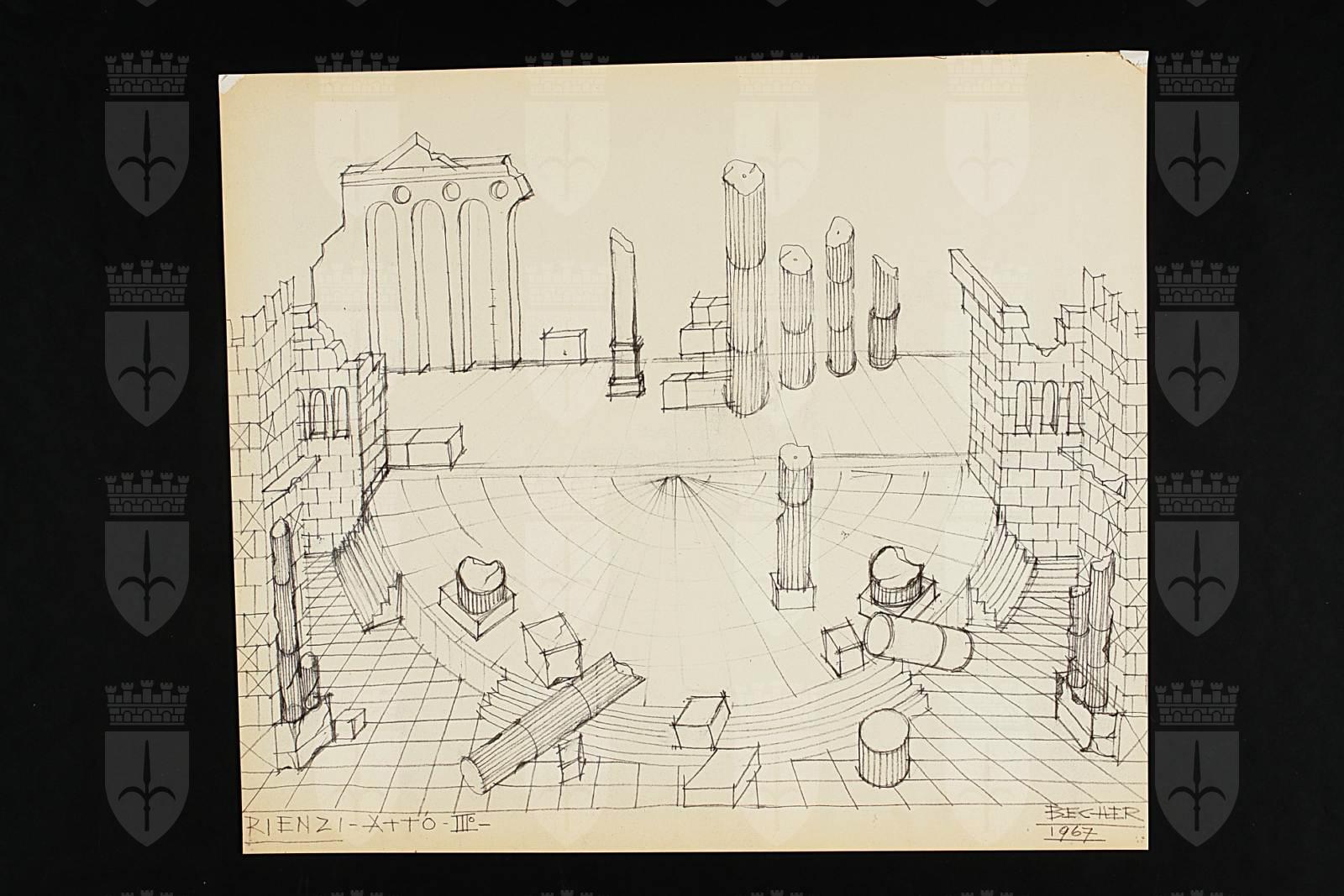 Scenografia per Rienzi, l'ultimo dei tribuni di Richard Wagner, Trieste, Teatro Verdi, stagione lirica 1967-1968, regia scene e costumi di Gianrico Becher