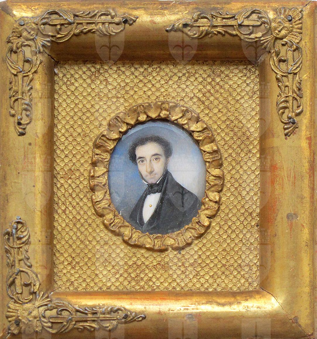 La miniatura ritrae un uomo rivolto di tre quarti, con il volto girato verso l’osservatore, che raffigurato indossa una rendigote nera, con un gilet e cravatta in tinta, su una candida camicia con sparato a piegoline, ornato da una spilla. Si tratta del ritratto di Guido Sigon, fratello di Sofia, di mano del pittore e miniaturista Andrea de Castro (Pirano, 1806-Trieste 1884), che lo eseguì nel quinto decennio dell’Ottocento, come attesta la firma lungo il margine inferiore sinistro, parzialmente celata dalla cornice.