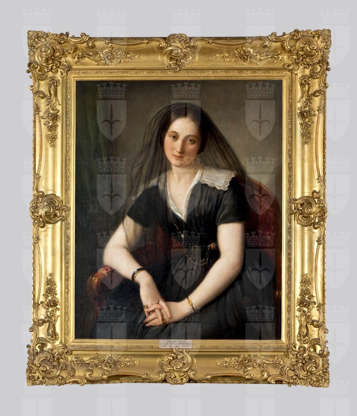 Ritratto di Adelaide RIstori, qui ritratta in giovane età con un velo nero che le copre la testa arrivando fino al busto. Una cintura con grossa fibbia sistemata sull'abito ne evidenzia il punto vita. A sottolineare la scollatura del vestito una catenina d'oro e pietre colorate, con saliscendi, alla quale è legata probabilmente un paio di occhialini. La donna indossa numerosi altri gioielli: tre bracciali e vari anelli d'oro, forse per rimarcare il nuovo status sociale acquisito. La posa acquisita dall'attrice in questo ritratto è in parte malinconico e al tempo stesso languido.