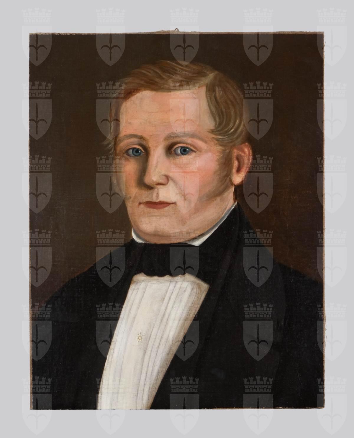 Ritratto del padre di Giuseppe Kaschmann ritratto a mezzo busto di fronte leggermente girato a sinistra. Indossa camicia plissettata bianca, un fiocco nero al collo, giacca nera abbottonata