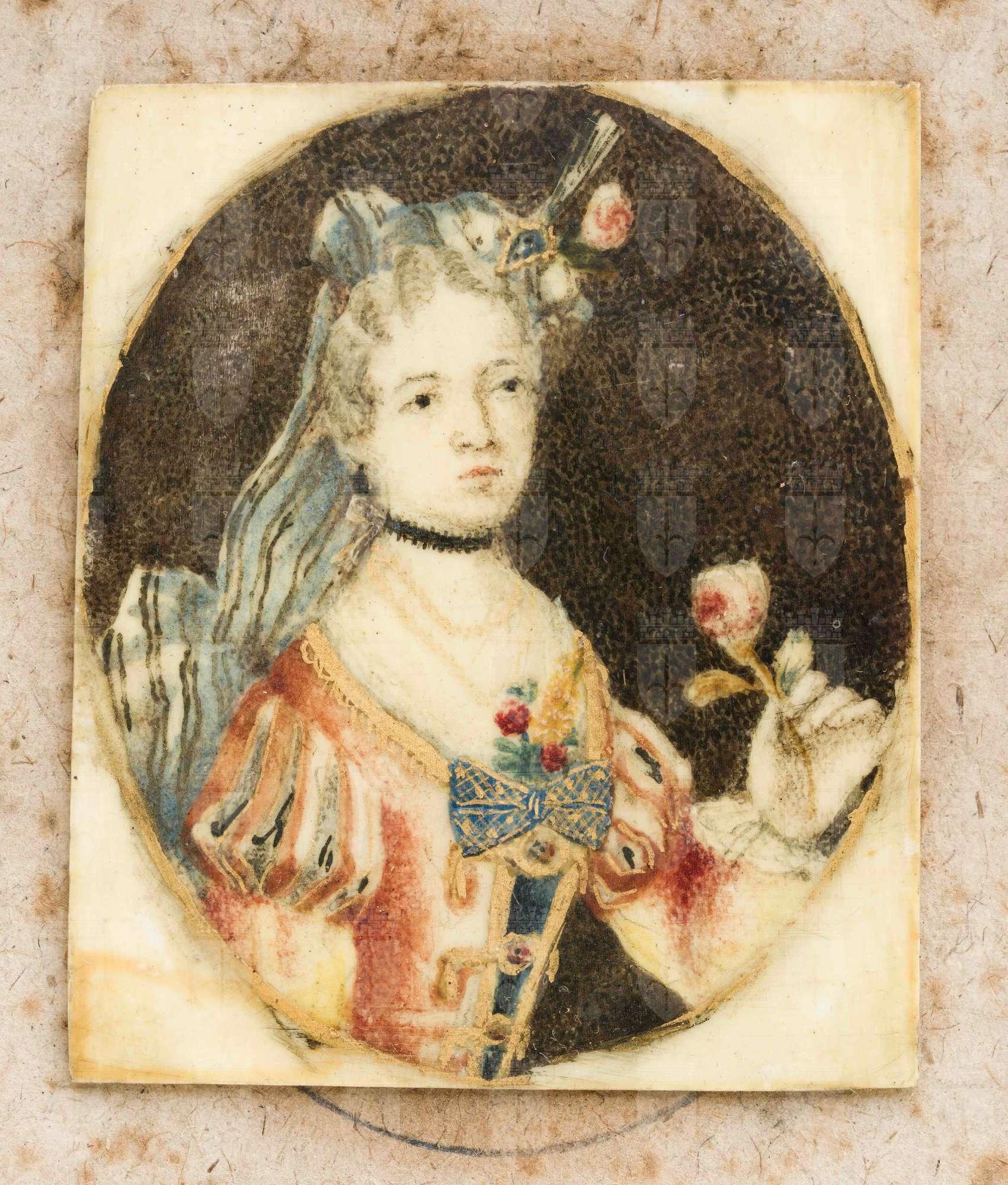 La miniatura, appartenente al legato di Margherita Nugent, raffigura Maria Nomessi de Nomisbach, sposatasi il 7 febbraio 1739 con il nobile triestino Geremia de Leo, ritratto nel pendant inv. 13/4882. Maria posa con il busto parzialmente ruotato verso destra. Il candore del volto e del decolté risaltano nell’accostamento al tessuto rosato dell’abito, guarnito con un bouquet di fiori sul petto, fissato con un fiocco blu, che richiamano quelli dell’acconciatura e la rosa tenuta in mano dall’effigiata.