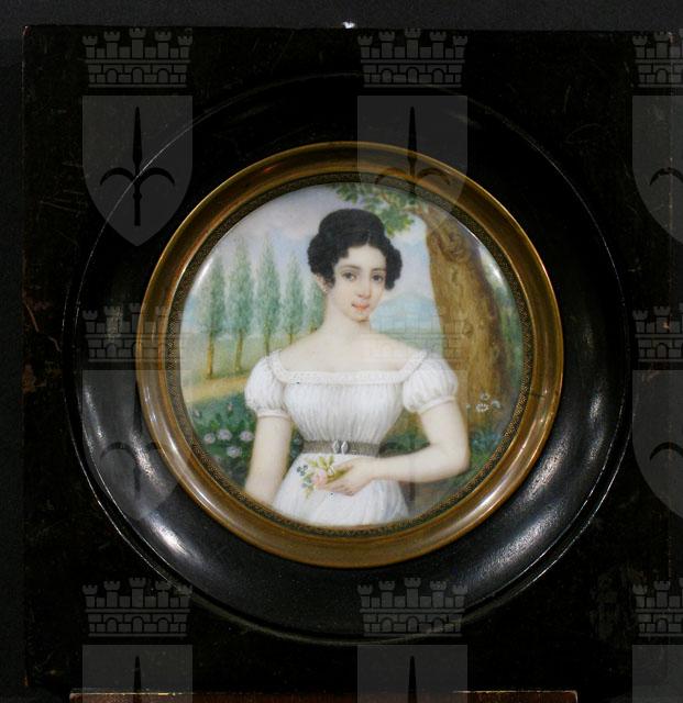 La miniatura, entrata nelle collezioni civiche nel 1976 attraverso il legato Rusconi-Opuich, è stata inventariata come opera eseguita a Vienna alla metà del XIX secolo. Essa presenta una giovane donna a tre quarti di figura, che regge dei fiori nella sinistra, tra cui si scorge una rosa centifolia e dei nontiscordardimé, che si staglia entro un giardino dove crescono rose, margherite e nontiscordardimé, mentre alle sue spalle vi è un viale alberato. La giovane donna indossa un abito, che risente ancora dello stile Impero di inizio secolo, lo scollo quadrato, le maniche corte leggermente gonfiate, ma il punto vita, sottolineato da una preziosa cintura, è leggermente sceso. I capelli sono pettinati con la scriminatura nel mezzo e raccolti sulla nuca, mentre alcuni boccoli incorniciano i lati del volto. Tali elementi suggeriscono di anticipare attorno agli anni venti l’esecuzione del manufatto.