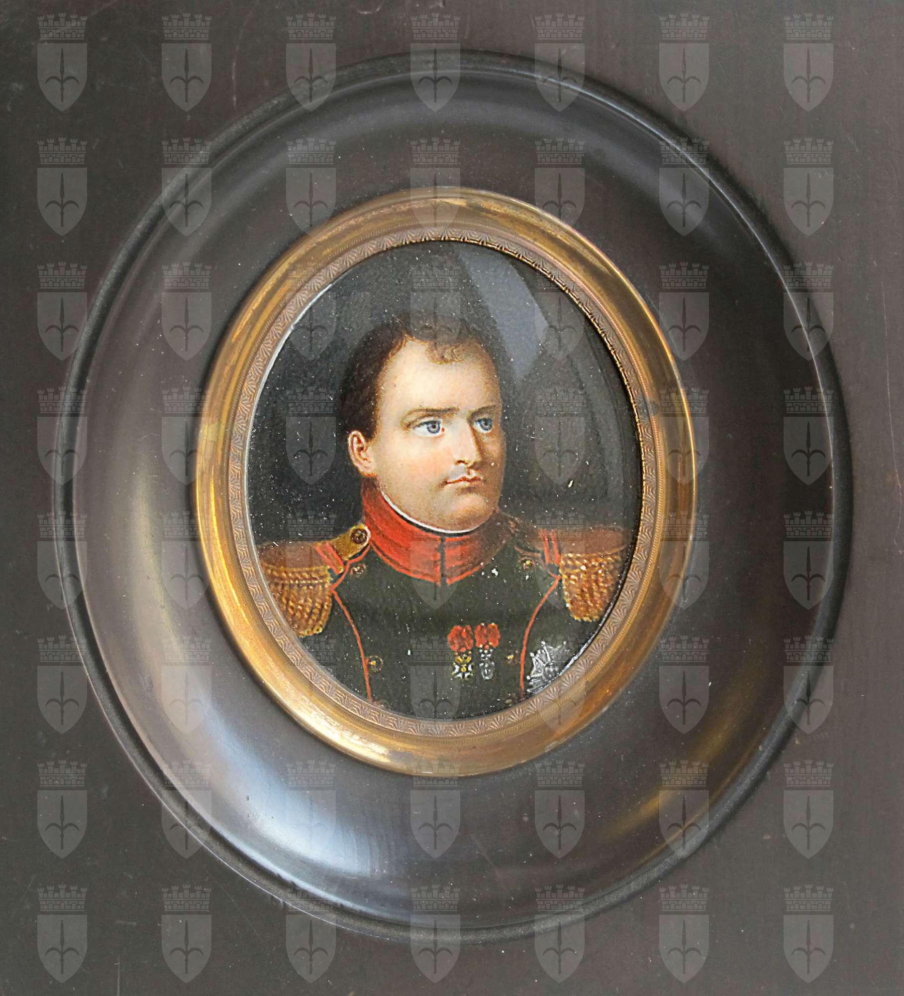 Miniatura ritratto di formato tondo che raffigura Napoleone Bonaparte a mezzo busto, rivolto di tre quarti verso destra, vestito in uniforme.