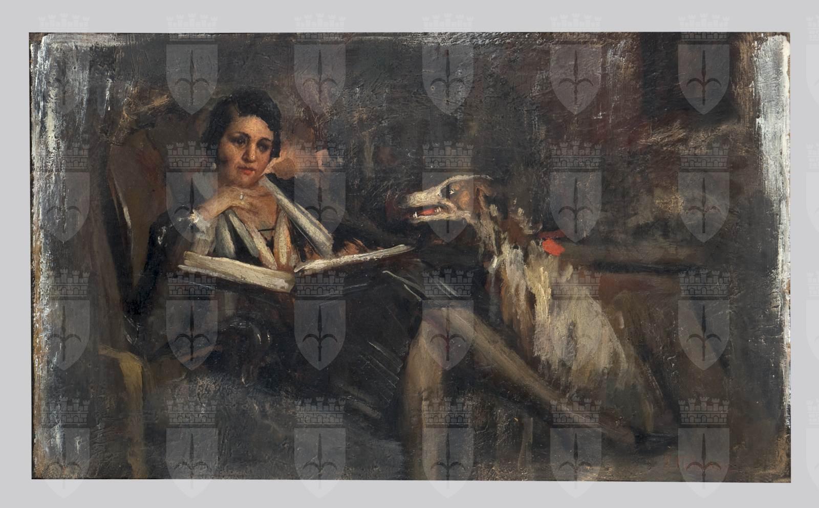 La soprano Ida Quaiatti (Spalato 1890-Venezia 1961) è qui ritratta in un interno a figura intera. Siede su una poltrona girata di tre quarti verso sinistra e con le gambe accavallate mentre legge un libro. Indossa una camicia bianca con un foulard al collo, giacca e gonna al ginocchio di colore scuro, scarpe décolleté con il tacco. Accanto a lei siede un levriero ripreso di profilo.