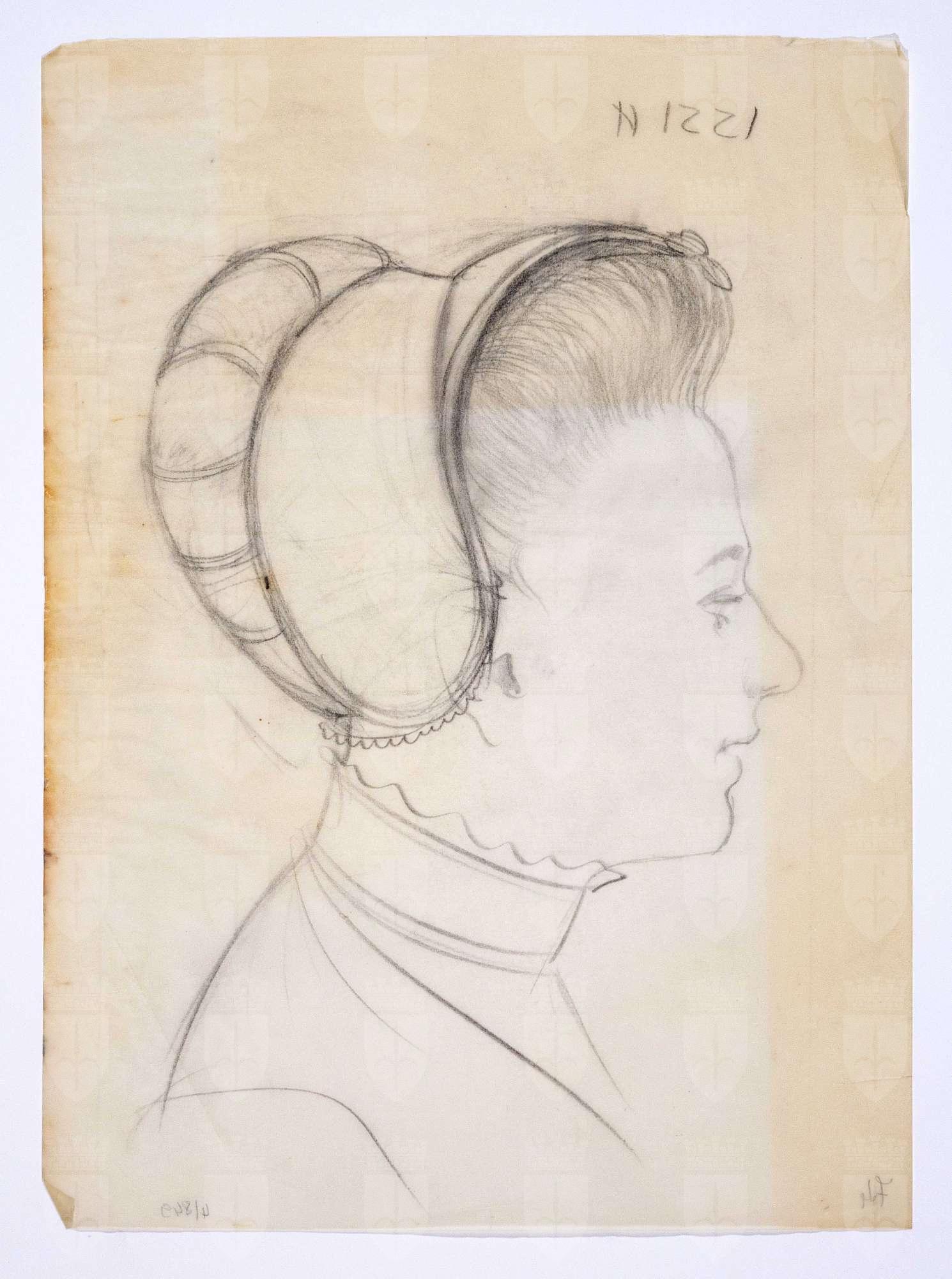 Il gioco dei potenti, libero adattamento di Giorgio Strehler da Enrico VI, dramma storico di William Shakespeare, in 15 atti e 2 giornate. Ritratto di testa femminile di profilo verso destra con i capelli raccolti sotto una cuffietta.