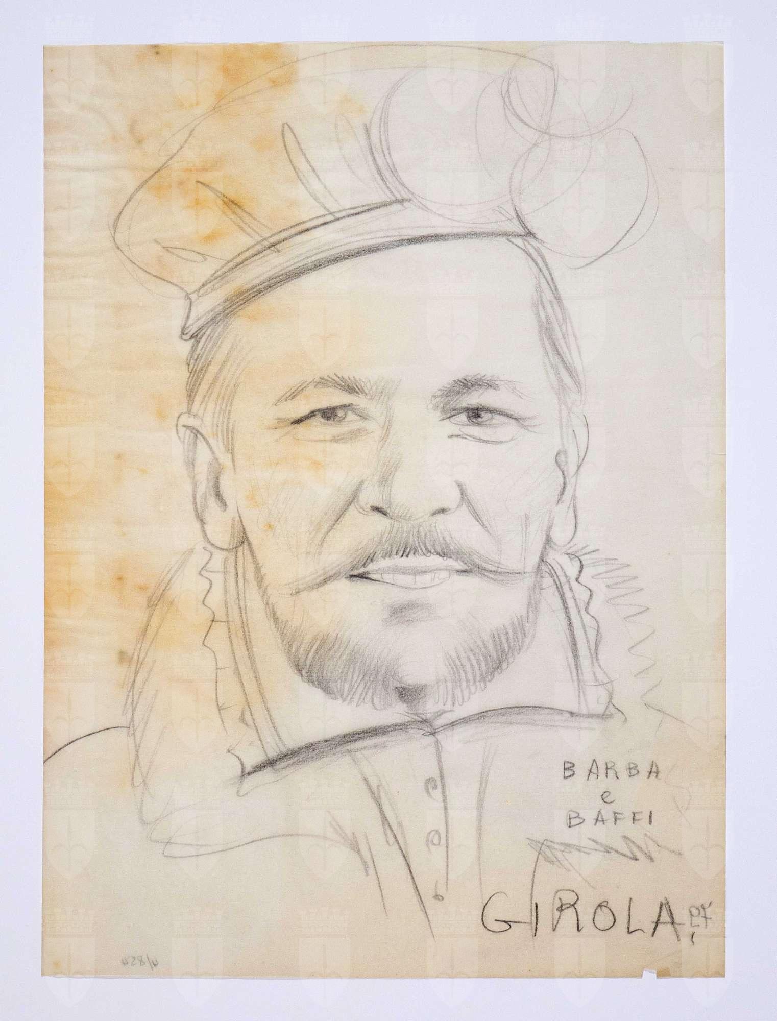 Il gioco dei potenti, libero adattamento di Giorgio Strehler da Enrico VI, dramma storico di William Shakespeare, in 15 atti e 2 giornate. Ritratto di testa maschile di fronte, con cappello rinascimentale, barba e baffi.