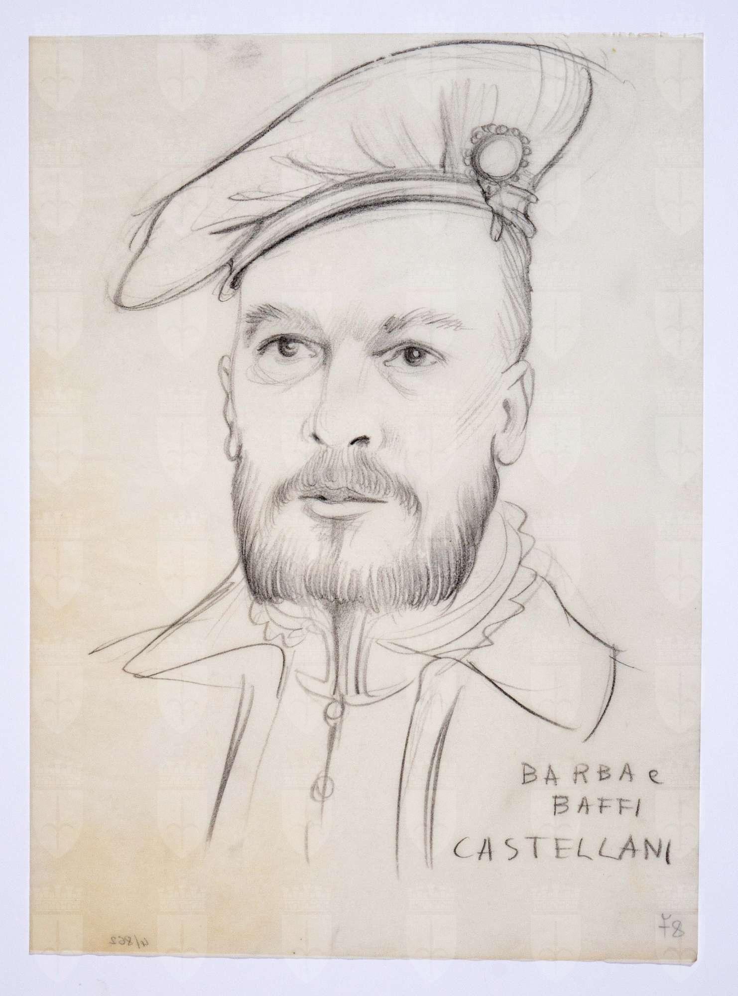Il gioco dei potenti, libero adattamento di Giorgio Strehler da Enrico VI, dramma storico di William Shakespeare, in 15 atti e 2 giornate. Ritratto di testa maschile leggermente di tre quarti, con copricapo piatto con fermaglio, barba squadrata e baffi, colletto montante con pizzo.