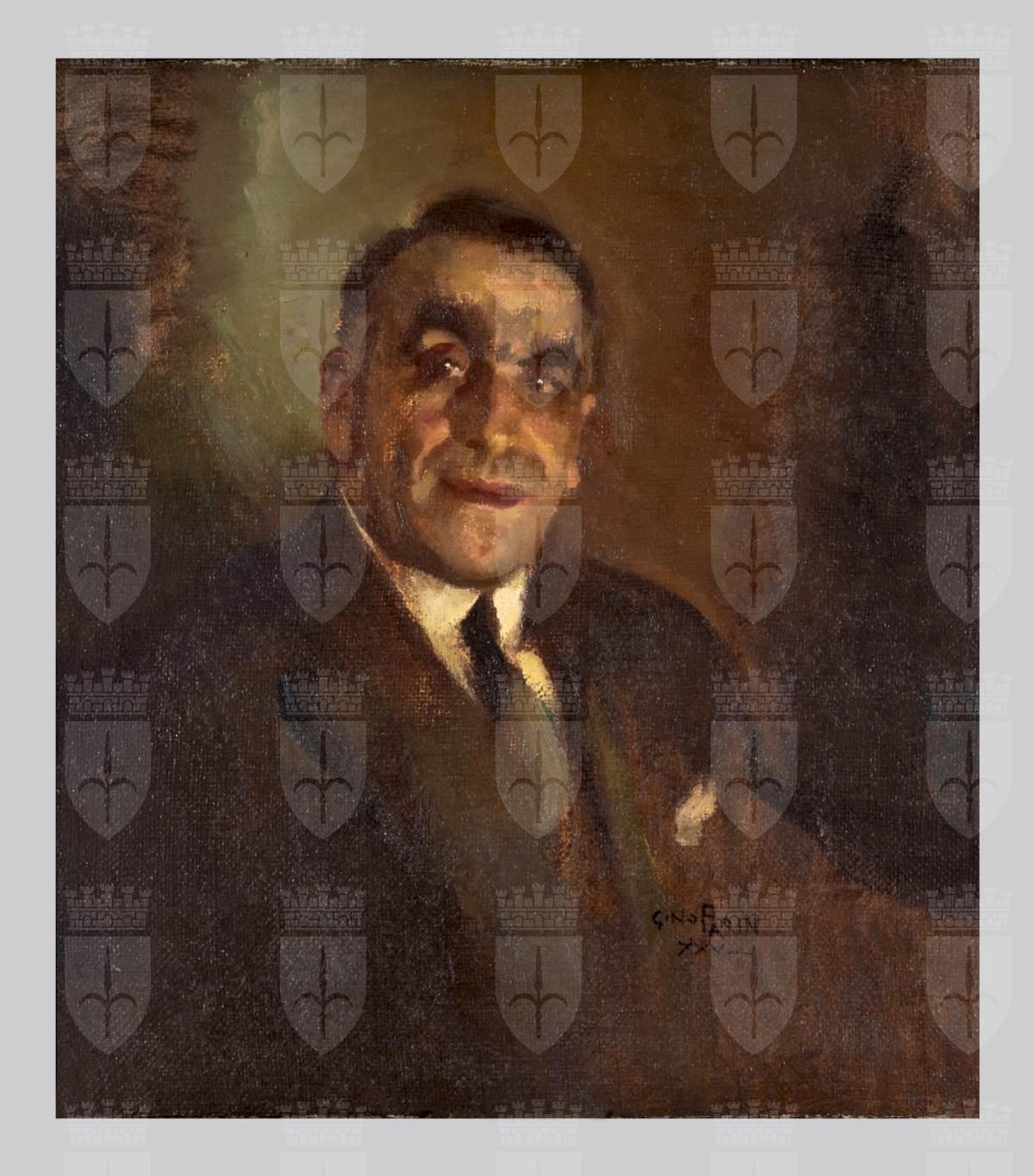 Nato a Rovigno d'Istria il 29 luglio del 1873, discendente da una famiglia che aveva dato valorosi capitani alla Repubblica di Venezia ne continuò la "tradizione di italianità". Da fervido irredentista studiò presso le università di Roma e Genova (dove si laureò in giurisprudenza). Nelle capitale iniziò a recitare facendosi notare fra la borghesia riuscendo ad emergere e diventare celebre attore comico riconosciuto a livello nazionale. Gino Parin lo ritrae a mezzo busto, non più giovanissimo con un sorriso ironico. Il dipinto risulta fortemente realistico il pittore infatti ha colto e reso eccelttentemente il volto dell'effigiato.
