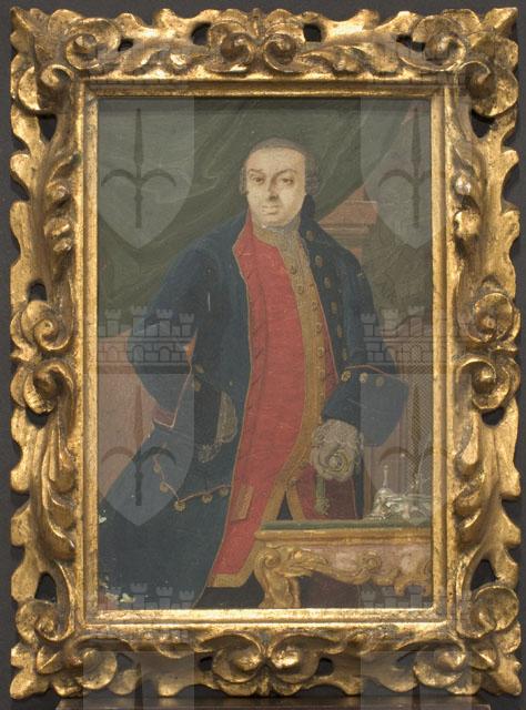 Il personaggio, ritratto all’interno di una stanza di cui si intravvede l’architettura, oltre al ricco tendaggio, è raffigurato in piedi, fino alla cintola, accanto a un tavolo sul quale poggia una campanella e un servizio da scrittura. Indossa una marsina blu con bottoni dorati, una sotto-marsina rossa con galloni dorati. Mentre la mano destra è appoggiata al fianco, l’altra reca verosimilmente una bussola.