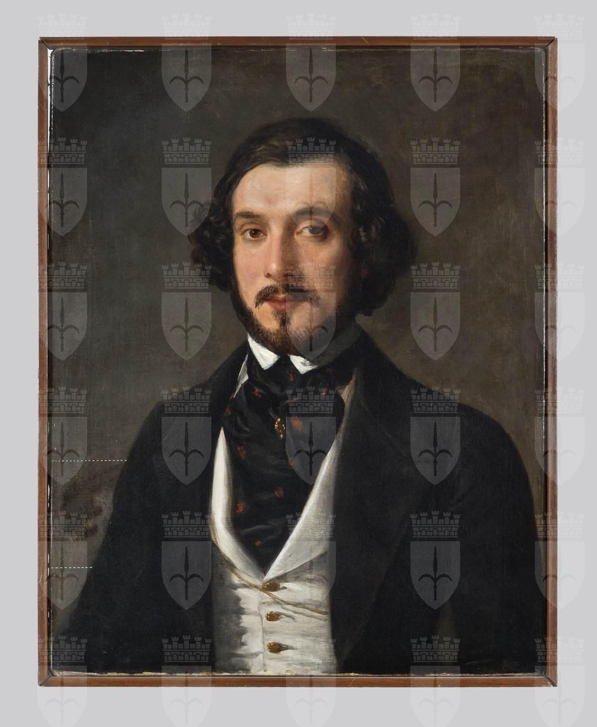 Ritratto a mezzobusto di Gaetano Donizetti da giovane, Sfondo scuro, volto di fronte, corpo leggermente ruotato verso destra. Indossa giacca scura, panciotto bianco con bottoni dorati, camicia bianca con collo alto e chiuso, larga cravatta nera con macchie rosse. Spilla alla cravatta