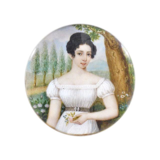 Dipinto in miniatura su avorio di formato tondo; ritratto femminile, tre quarti di figura, paesaggio.