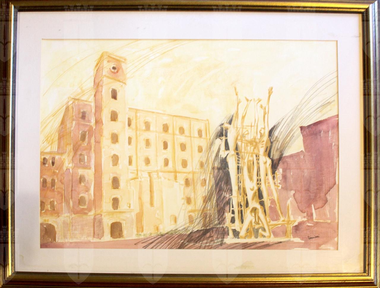L'opera rappresenta la Risiera di San Sabba, in particolare sulla sinistra si vede uno scorcio dell'edificio di 6 piani visto dal cortile centrale, reso in rosso e giallo con segni grafici gialli, e sulla destra la scultura "I martiri" di Marcello Mascherini, dietro a essa i due edifici di quattro e tre piani, senza dettagli, di colore rosso scuro. L'opera plastica è resa con un colore giallo e attorno segni grafici, neri, decisi.