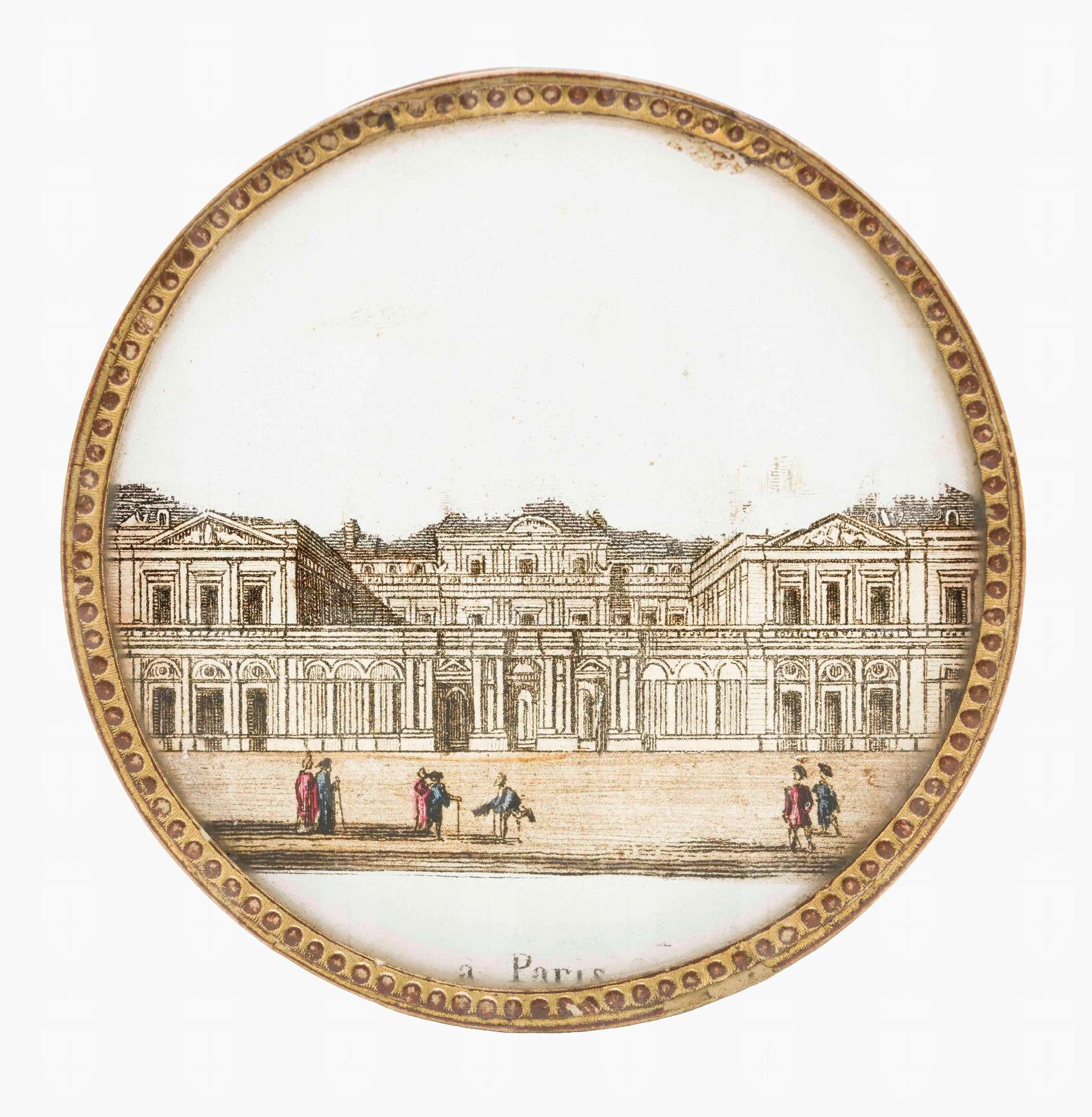Scatolina circolare in vetro con veduta di palazzo parigino sul coperchio.
