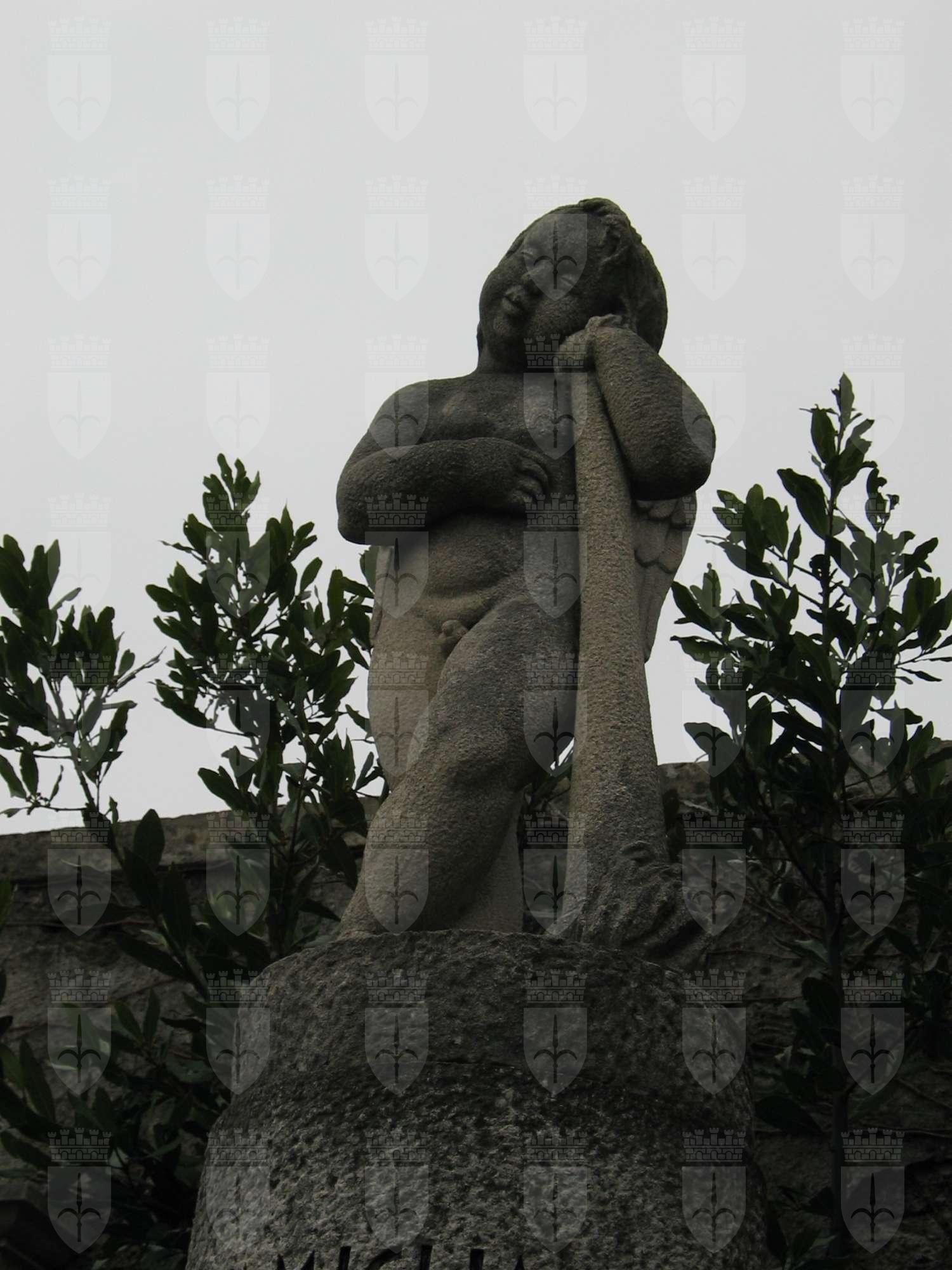 Sopra un'alta colonna con iscrizoni un puttino, alato ed ignudo, si appoggia ad una fiaccola rovesciata.